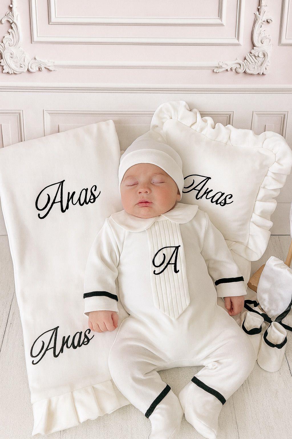 This stylish Ecru Complete Set with Black Piped and Letter Embroidered is crafted from soft, breathable cotton jersey fabric, offering a comfortable fit and freedom of movement. The set includes a blanket, pillow, romper, hat, booties, and gloves, all beautifully detailed with black piping and personalized letter embroidery. This set can be customized with a name, adding a unique and thoughtful touch. Combining elegance, comfort, and personalization, this set is a perfect choice for those seeking a refined and cozy look.