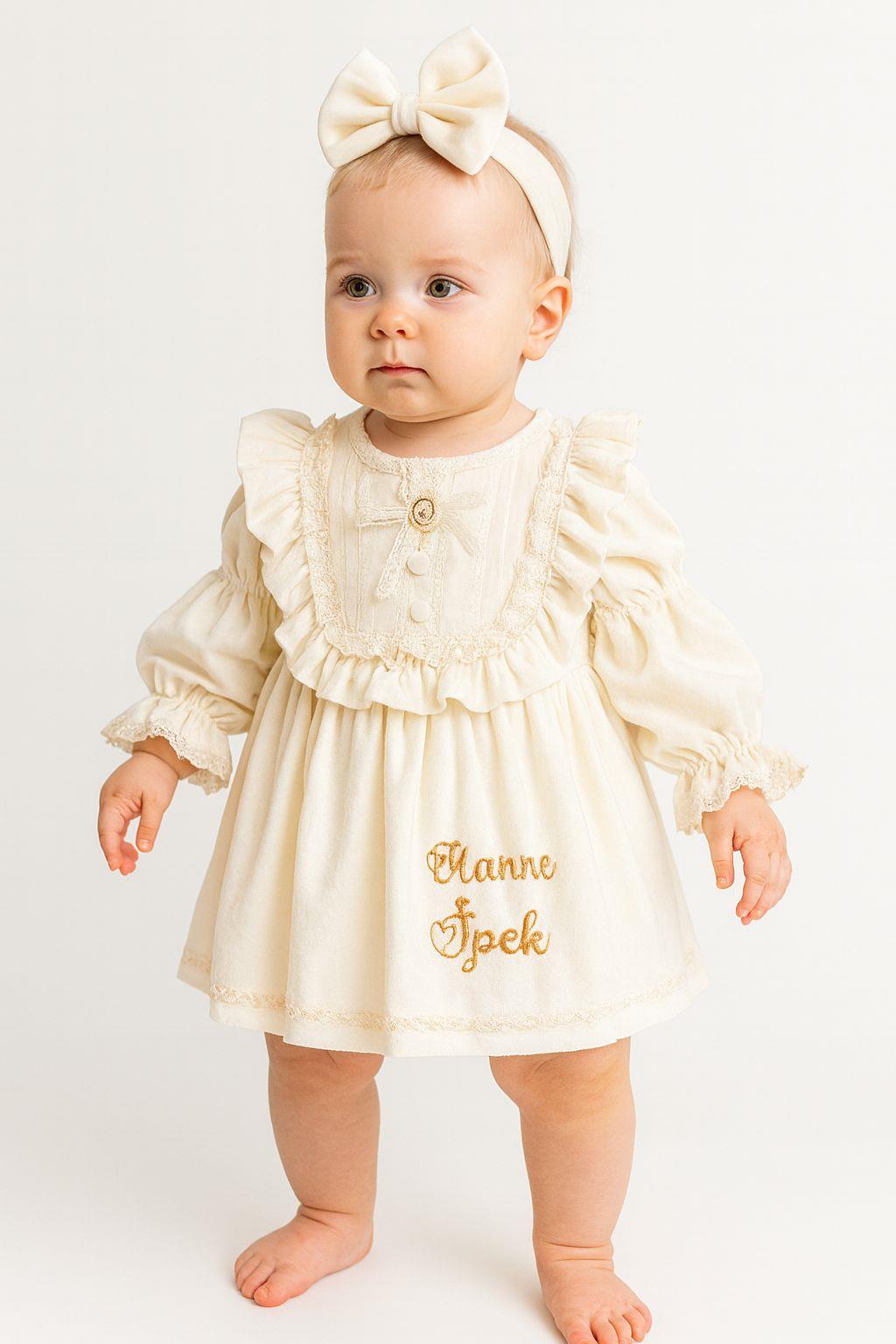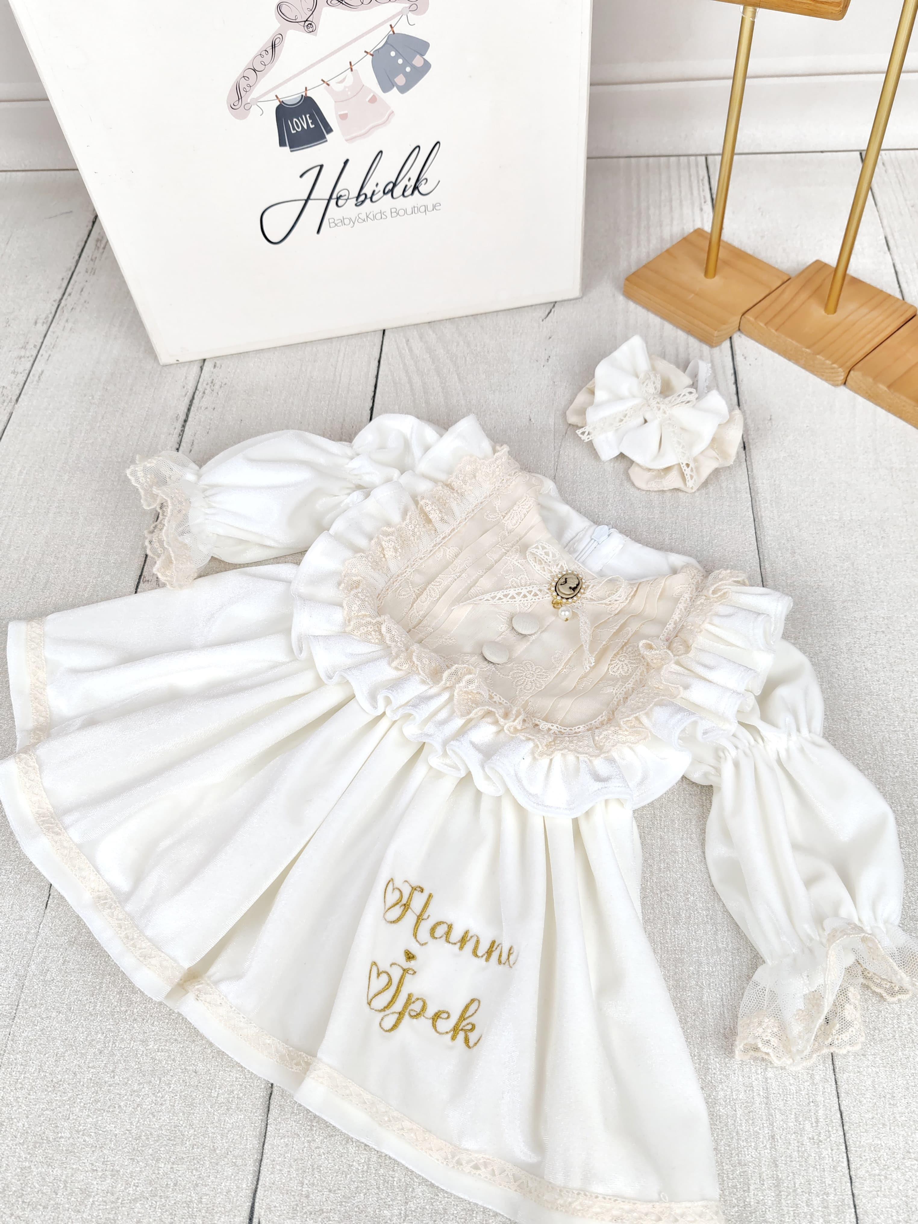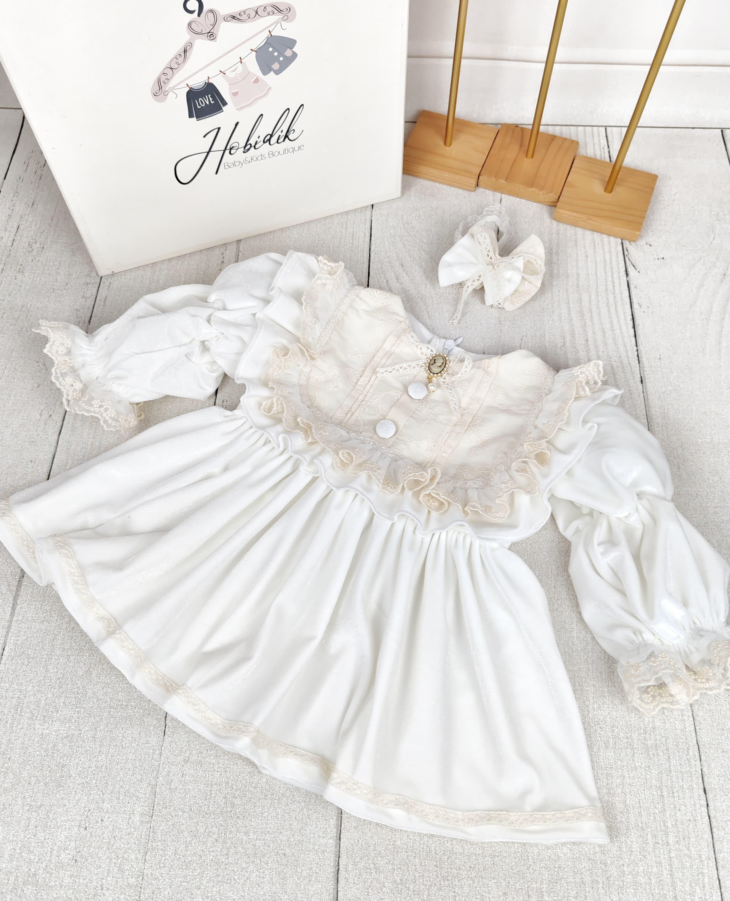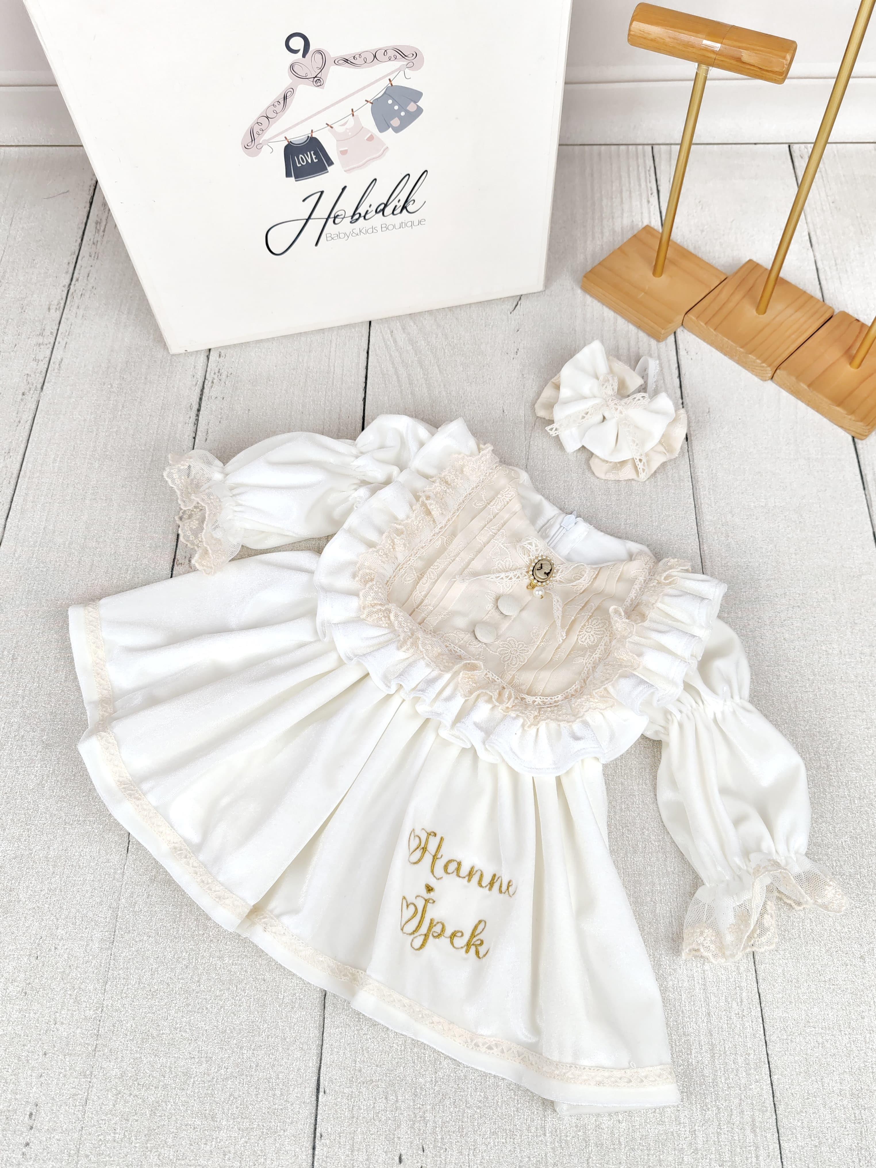 The Cream Guipure Off-White Silk Velvet Dress is a stunning choice for your little princess's special days, combining timeless elegance with perfect comfort. Designed with the finest materials, this dress is perfect for sophisticated events and offers a perfect blend of style and softness.