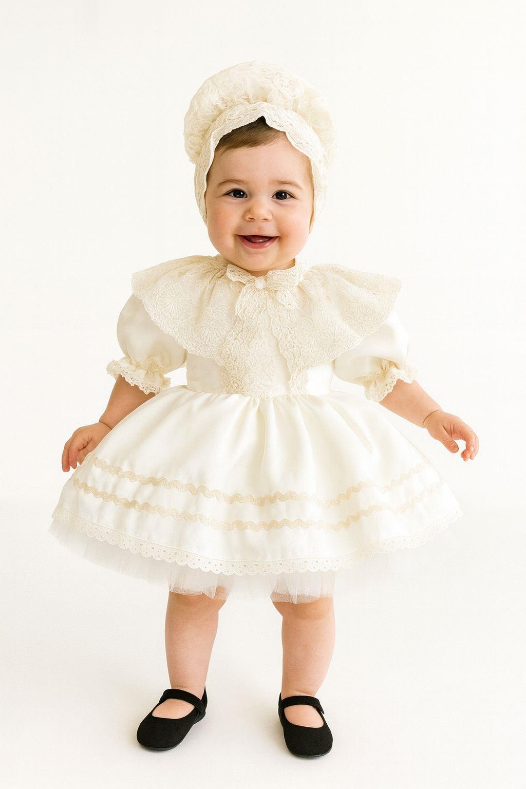 The Creme Vintage Cape Collar Birthday Dress is a stunning choice for your little princess's special days, combining timeless elegance with perfect comfort. Designed with the finest materials, this dress is perfect for sophisticated events and offers a perfect blend of style and softness.