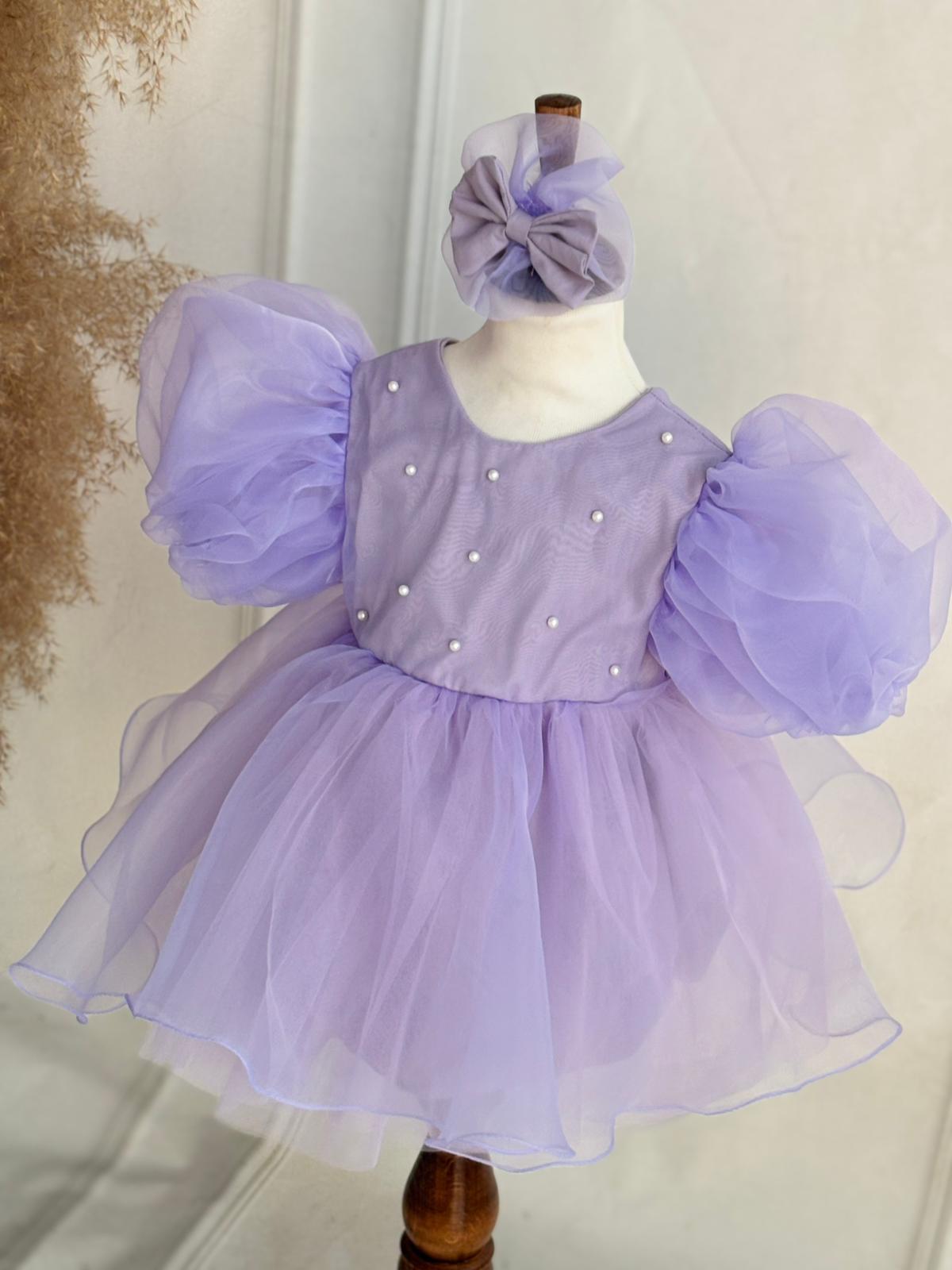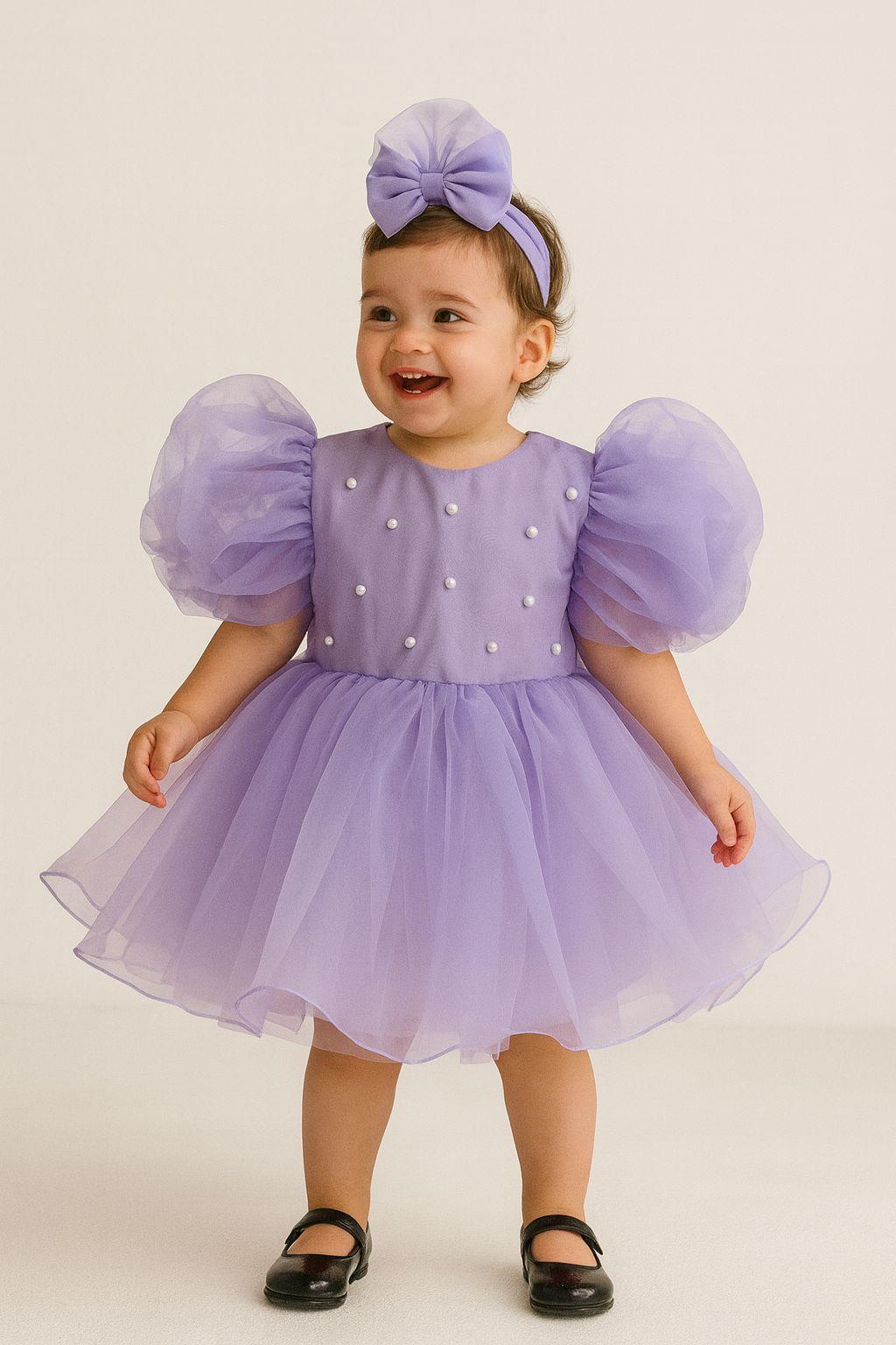 Küçük prensesinizin zarafetini ön plana çıkaran lila tüllü prenses elbise 💜 Yumuşak tül katmanlarıyla hacimli bir görünüm sunan bu özel tasarım elbise, göğüs kısmındaki zarif inci işlemeleriyle dikkat çeker. Sade balon kollar, kabarık tül etek ve elbiseyle uyumlu büyük tül fiyonk saç bandı kombinle kusursuz bir bütünlük oluşturur. Rahat astarı sayesinde bebeğinizin cildine nazik bir dokunuş sağlar.