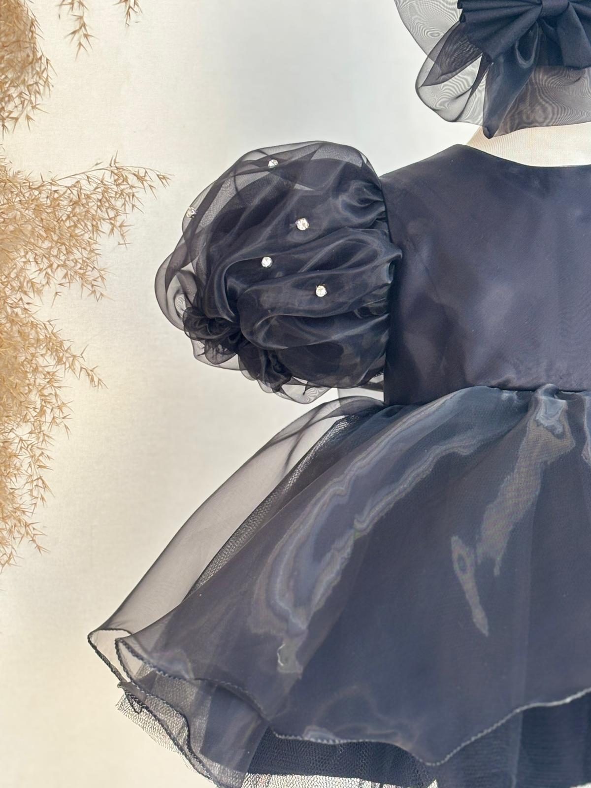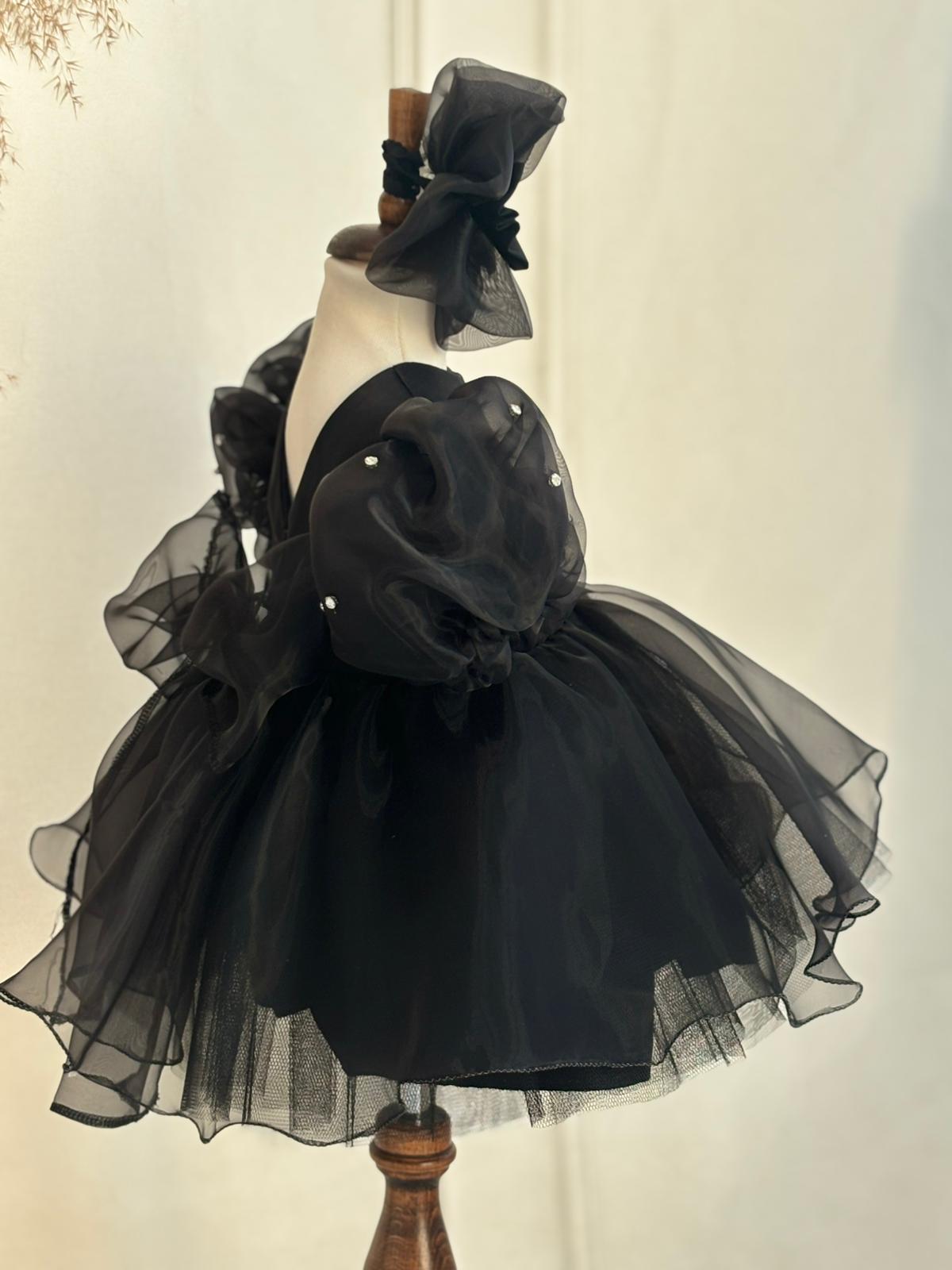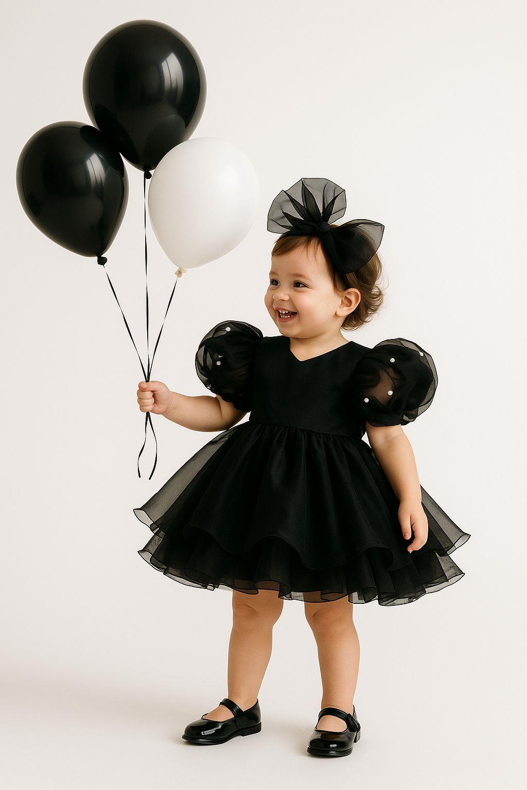 Küçük prensesiniz için asil bir şıklık! 👑 Bu zarif siyah tüllü elbise, kabarık etek tasarımı ve taş süslemeli balon kollarıyla özel günlerin vazgeçilmezi. Hafif tül kumaşı sayesinde hareket özgürlüğü sunarken, iç astarı cilde yumuşak bir dokunuş sağlar. Setin içinde yer alan tüllü büyük fiyonk saç bandı, kombini tamamlayarak şık bir bütünlük oluşturur.