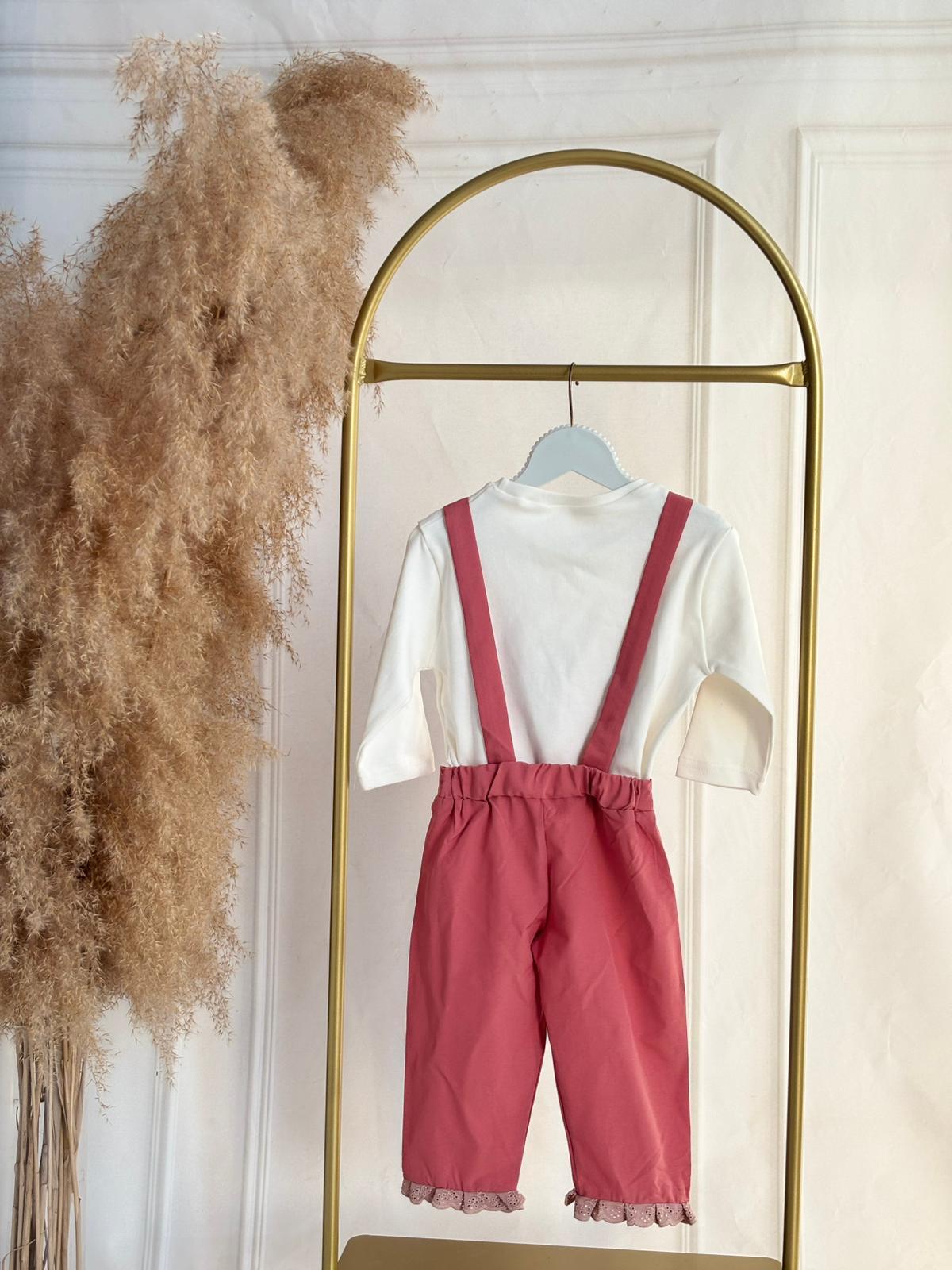 Sevimli tarzıyla dikkat çeken bu kız bebek kalp detaylı pembe salopet takımı, minik prensesiniz için hem rahat hem de göz alıcı bir alternatif sunar. Ürün, kırık beyaz uzun kollu üst ve ön kısmında kalp şeklinde dantel detaylı pembe salopetten oluşur. Alt kısmındaki fırfır detaylarıyla tatlı bir görünüm kazandırılmıştır.