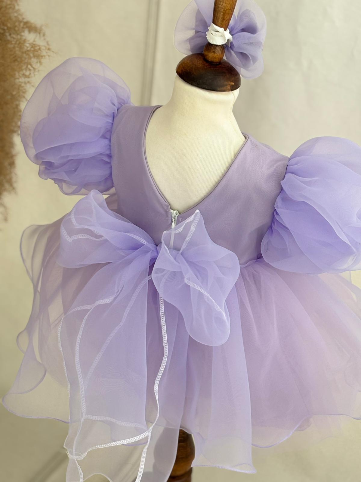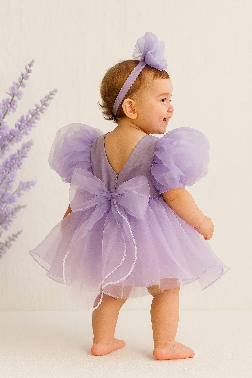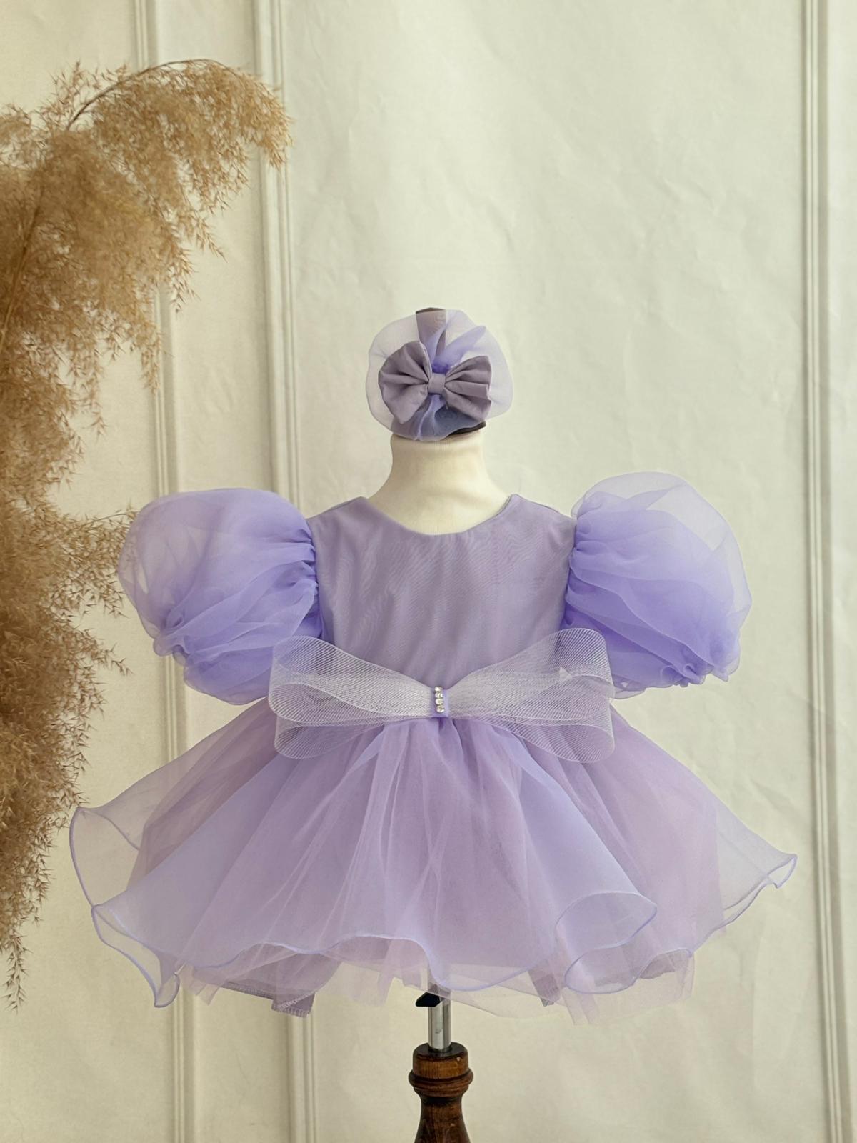 Bu zarif lila tüllü kız bebek elbisesi, özel günler için şıklığı ve rahatlığı bir araya getiriyor. Kabartmalı kol detayları ve uçuşan tül eteği ile minik prensesiniz için göz alıcı bir görünüm sunar. Bel kısmında yer alan taş detaylı gren fiyonk elbiseye zarif bir dokunuş katarken, elbise ile uyumlu büyük fiyonklu saç bandı şıklığı tamamlıyor. Yumuşak iç astarı sayesinde bebek cildine dost ve gün boyu konforludur.