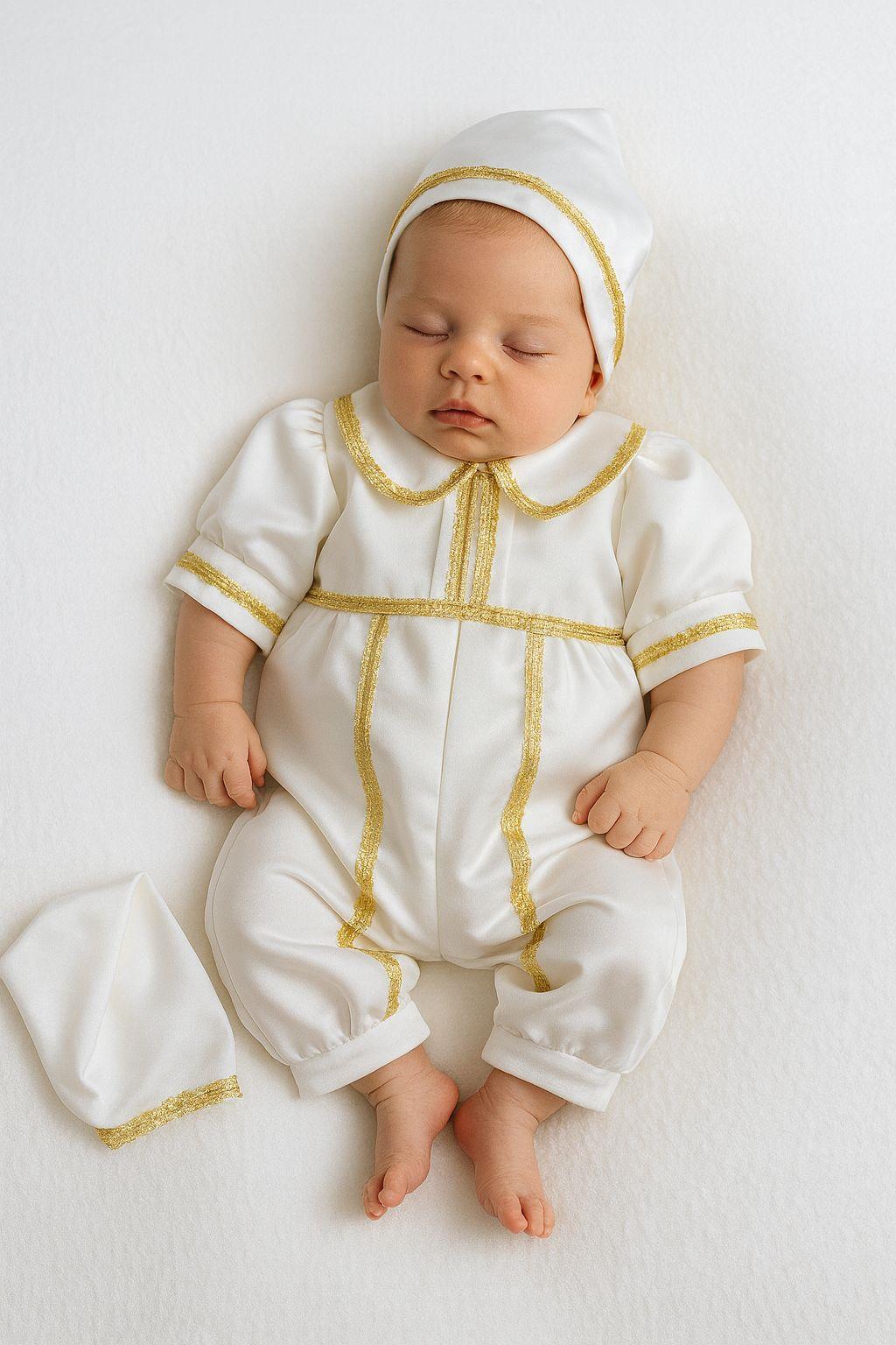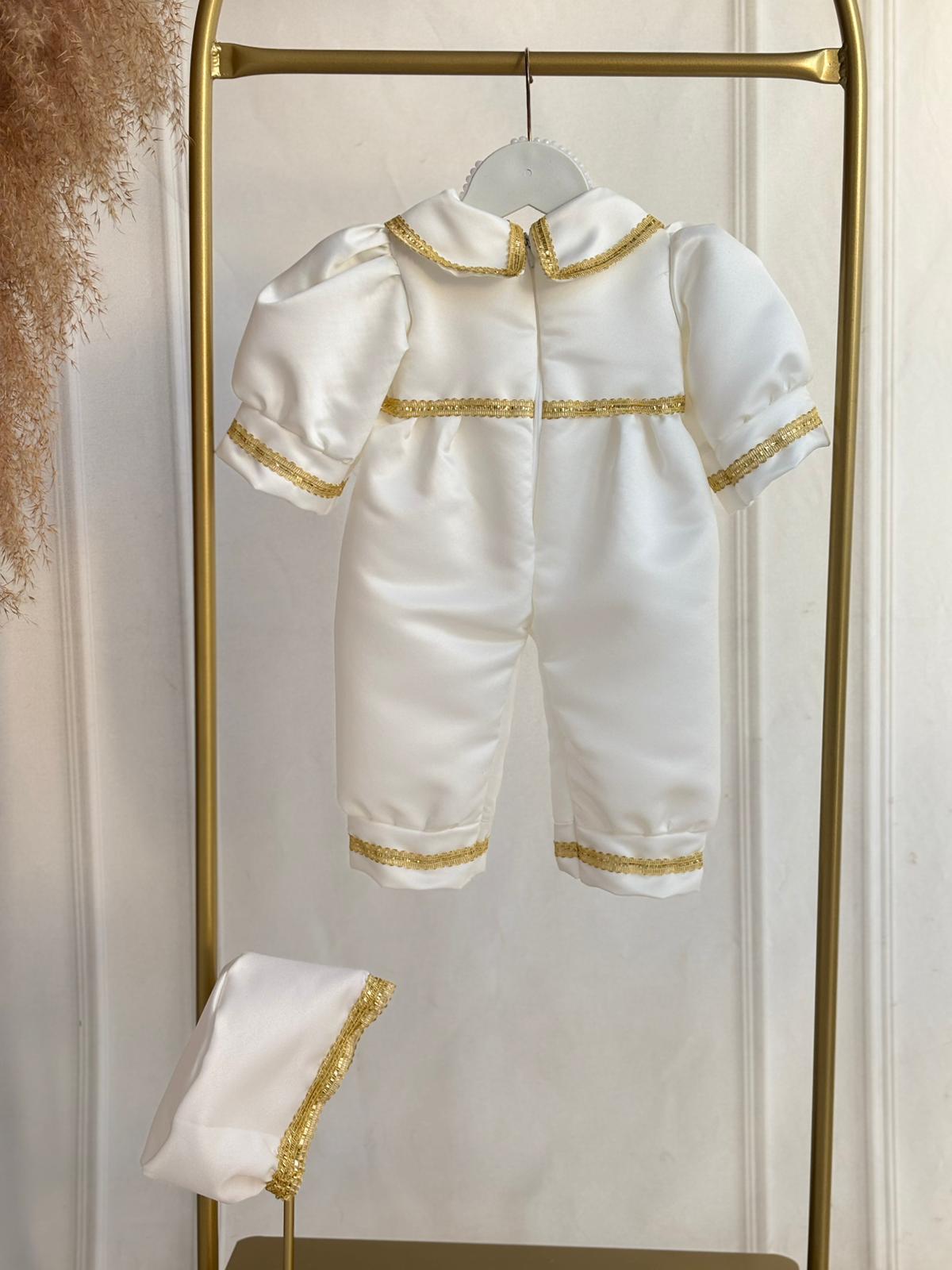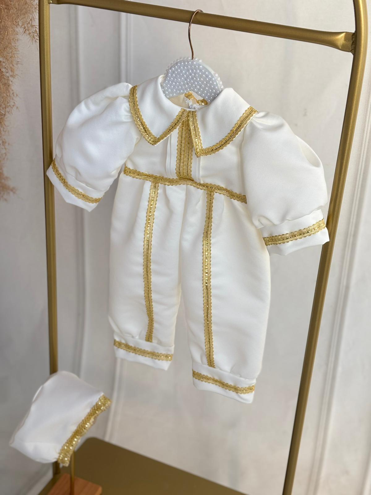 Bebeğinizin en özel günlerinde şıklığını tamamlayacak bu altın detaylı erkek bebek tulum takımı, zarif ve sade tasarımıyla göz kamaştırıyor. Mevlüt, sünnet, doğum günü, diş buğdayı veya fotoğraf çekimleri gibi özel anlar için ideal bir tercih!