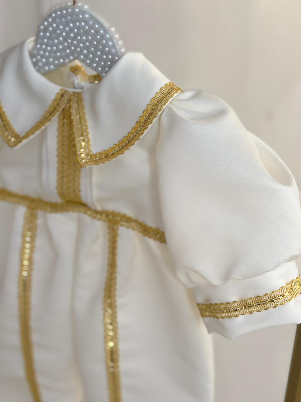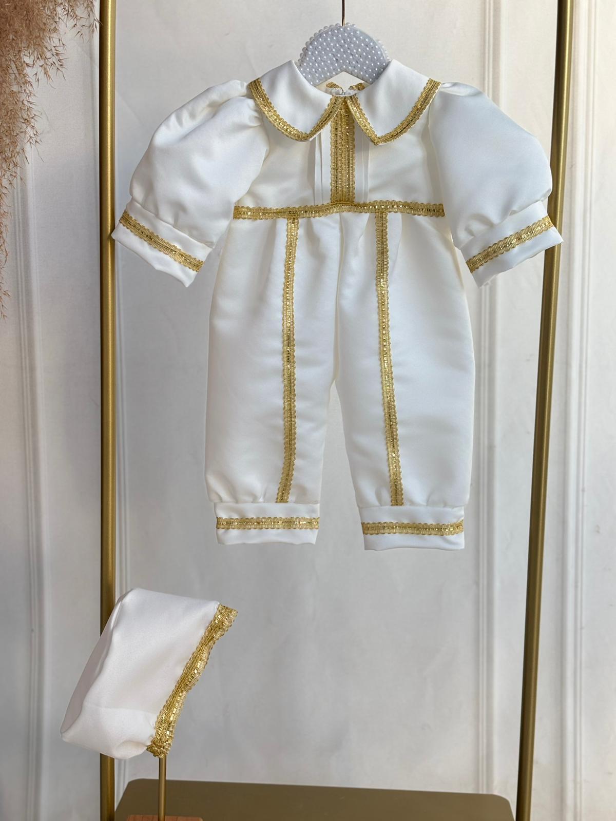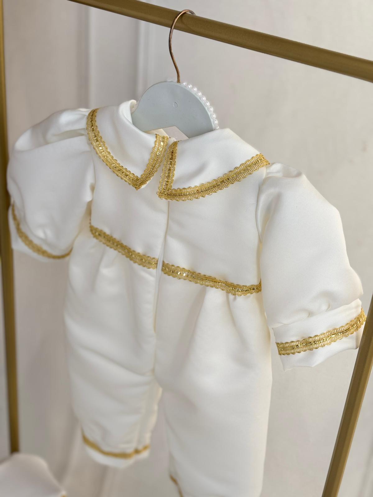 Bebeğinizin en özel günlerinde şıklığını tamamlayacak bu altın detaylı erkek bebek tulum takımı, zarif ve sade tasarımıyla göz kamaştırıyor. Mevlüt, sünnet, doğum günü, diş buğdayı veya fotoğraf çekimleri gibi özel anlar için ideal bir tercih!