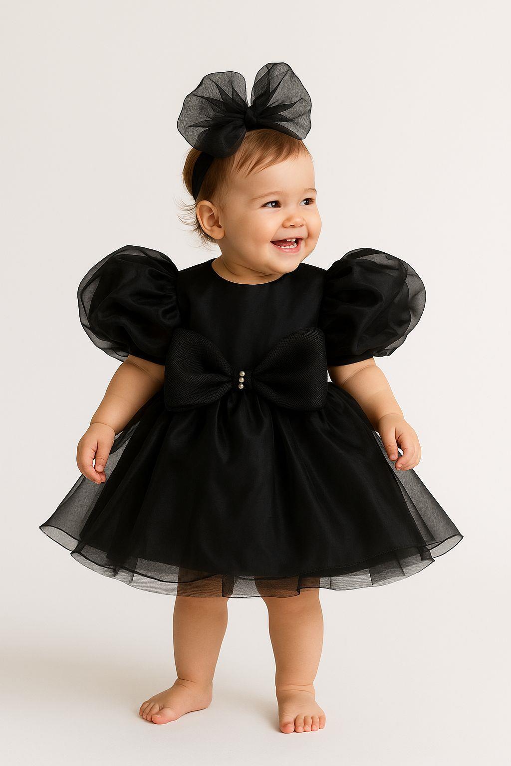 Minik prensesiniz için şıklığı ve zarafeti bir araya getiren bu siyah tüllü kız bebek elbisesi, özel günlerde ve doğum günü kutlamalarında göz alıcı bir tercih olacak. Kabartmalı kol detayları ve etek uçlarındaki zarif tül katmanları ile tasarlanan bu model, orta kısmındaki gren fiyonk detayıyla dikkat çekiyor. Yumuşak astarı sayesinde bebeğinizin hassas cildine uyumludur ve rahat bir kullanım sunar.