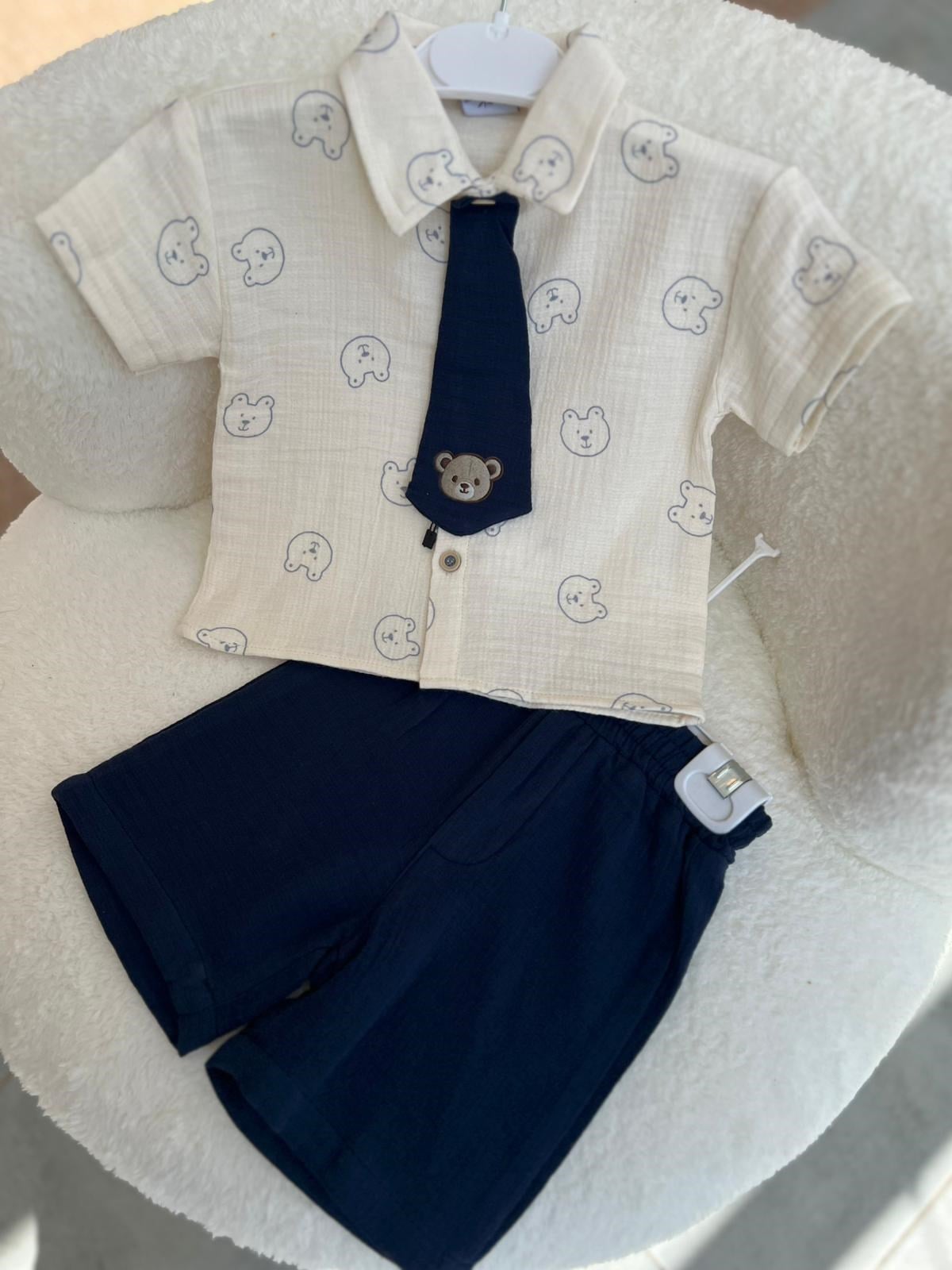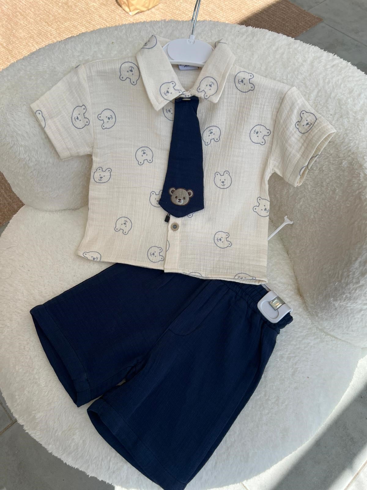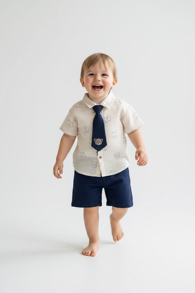 Sevimli ayıcık desenli kısa kollu gömlek ve şık kravat detayı ile klasik bir görünüm kazandırırken, rahat kesim şort ile hareket özgürlüğü sağlar. Özel günler, doğum günü, fotoğraf çekimleri ve günlük şıklık için ideal bir kombin sunar.