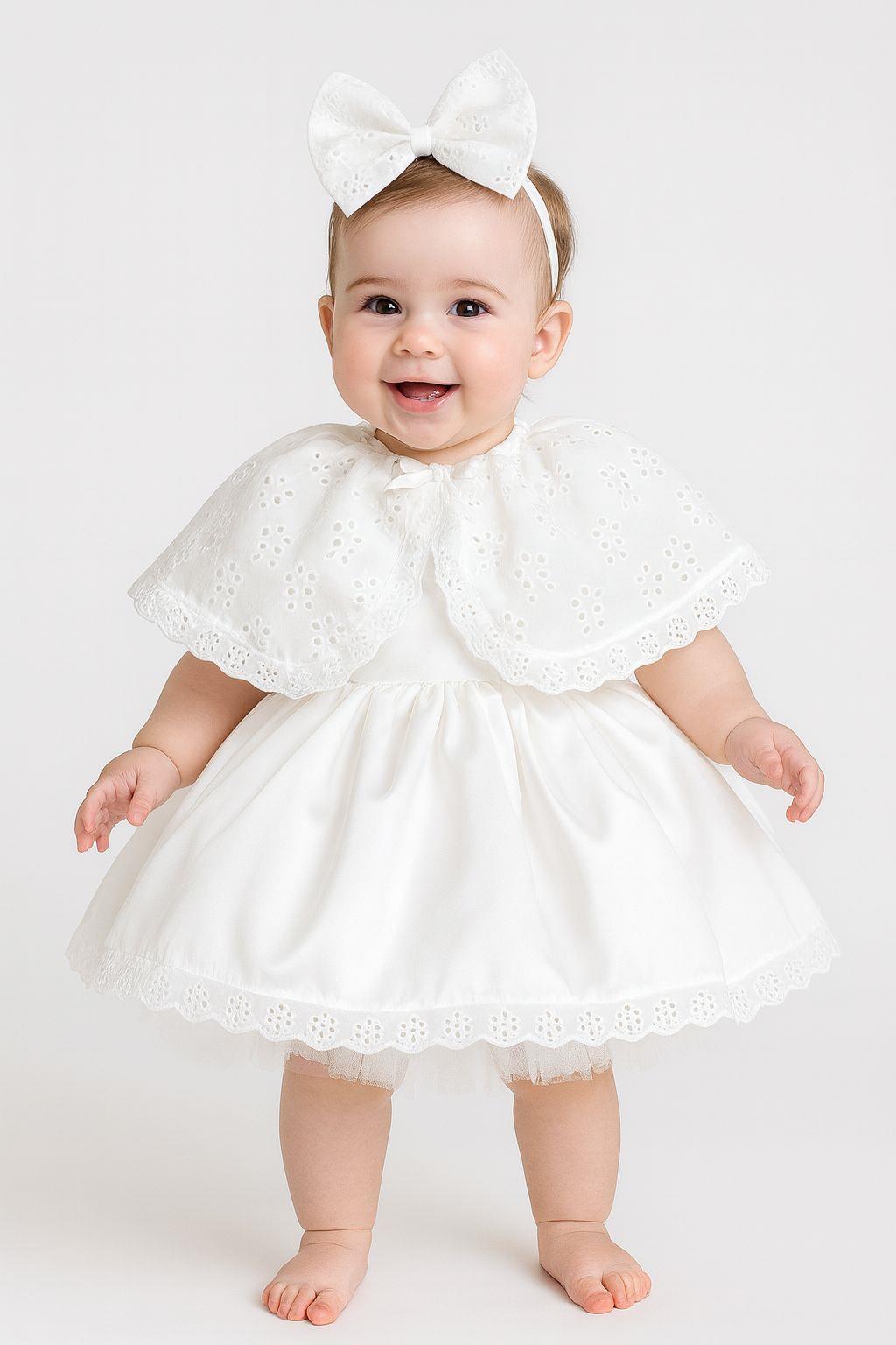 Pelerin Tasarımı: Şık pelerin tasarımı, elbiseye ekstra zarafet katar. Pelerin, bebeğinizin her adımında zarif bir hareket ve şıklık sağlar, ayrıca elbiseye sofistike bir hava kazandırır.