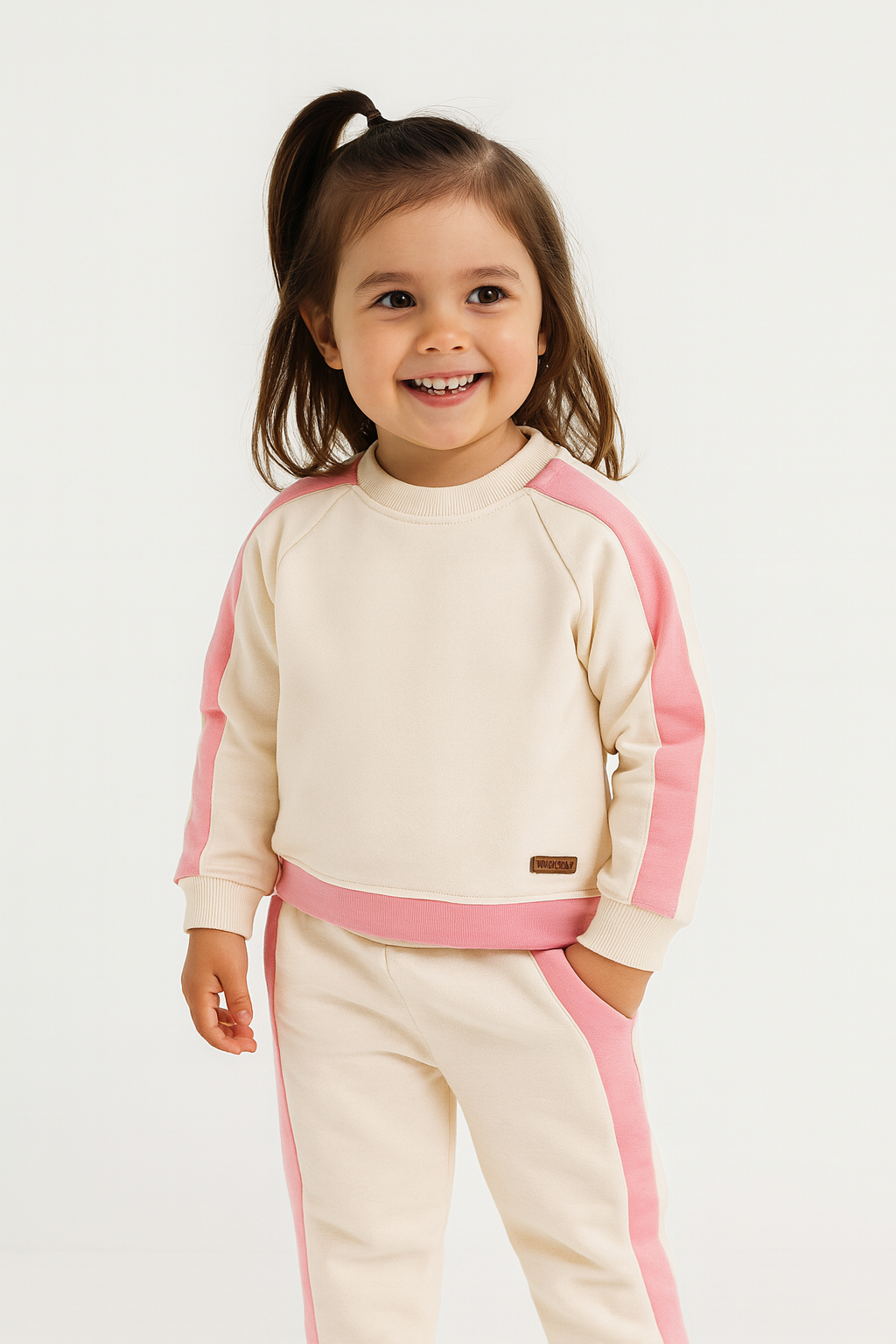 The Girls' Beige Top and Bottom Set with Pink Stripes combines elegance and cuteness! Its soft fabric ensures a comfortable fit, while the beige color provides a sophisticated look. The pink stripes add a fun and sporty vibe to the set. An ideal choice for little ones looking for both comfort and style!