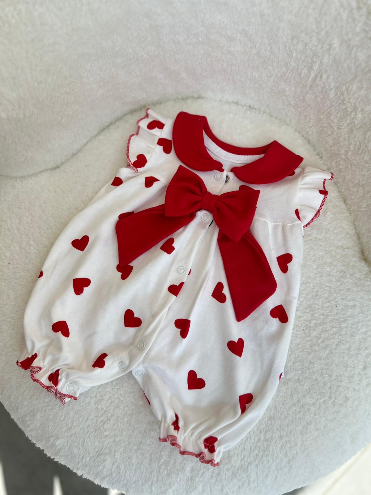 * Pamuklu yumuşak kumaş * Şık kırmızı kalp desenli tasarım * Büyük fiyonk ve yaka detaylı * Çıtçıtlı alt kapama (kolay kullanım) * Günlük kullanım ve özel günler için ideal