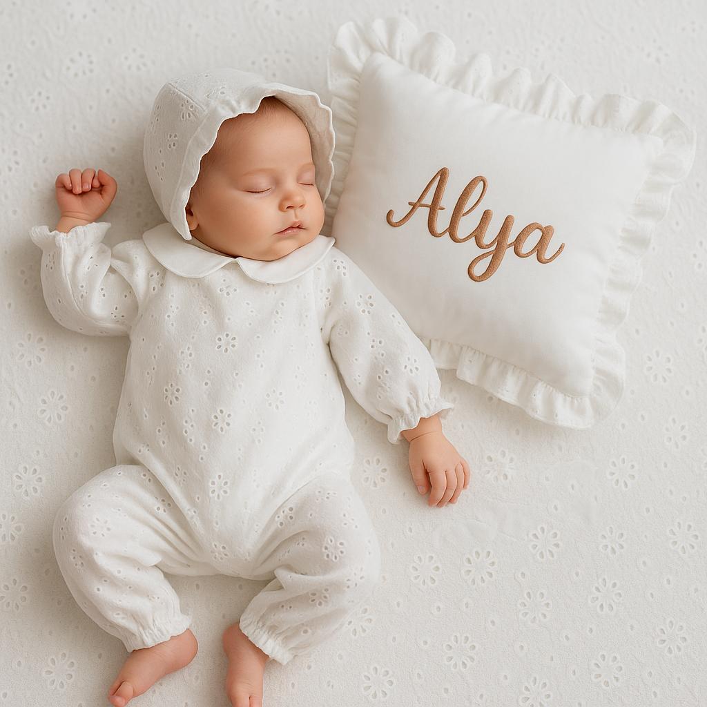 Indulge in sophistication and comfort with our Off-White Eyelet Lace Jumpsuit and Pillow Set. This stunning jumpsuit features intricate eyelet lace detailing, offering a delicate and feminine touch to its timeless off-white design. The soft, breathable fabric ensures maximum comfort while the flattering fit makes it perfect for any occasion, from casual outings to more refined events.