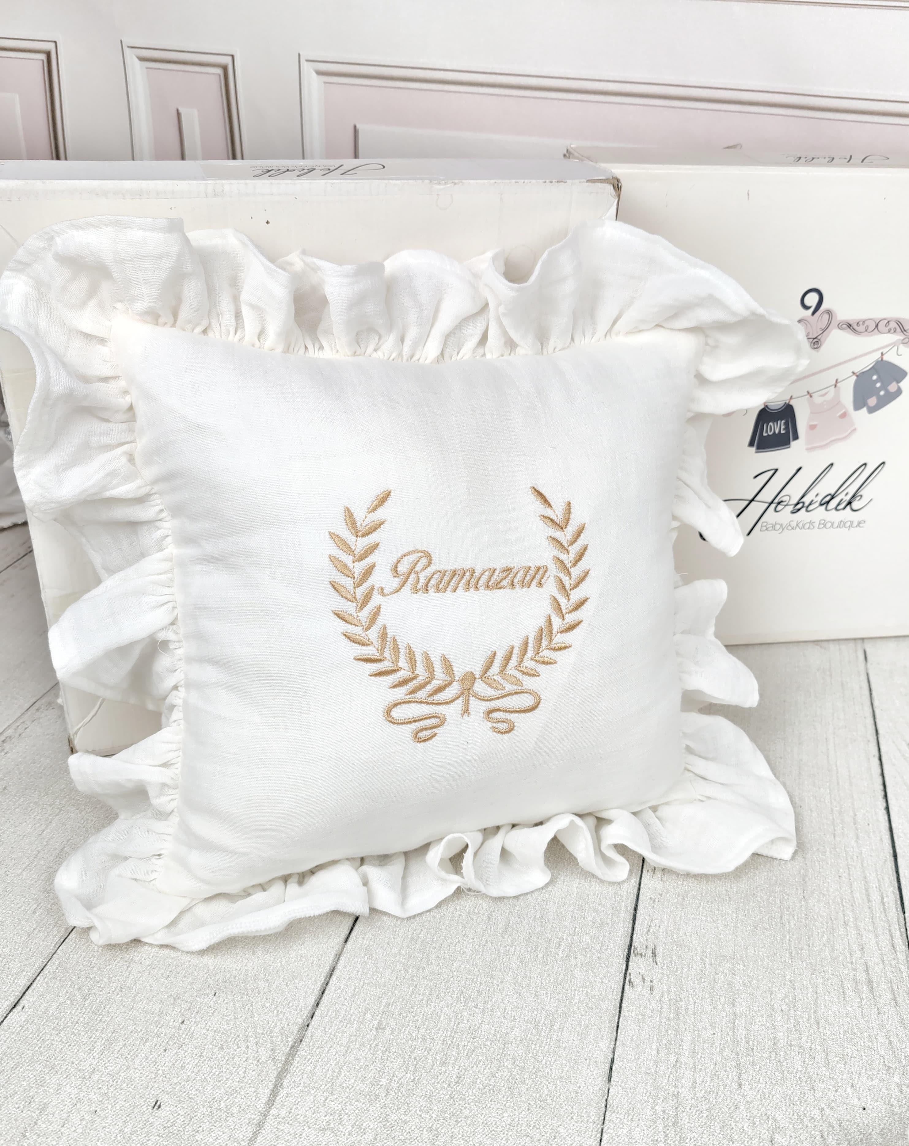 Whether placed on a bed, chair, or sofa, this pillow adds a cozy yet sophisticated element to your home. The off-white color provides a neutral backdrop, allowing the embroidered garland and ruffles to stand out beautifully. Custom embroidery options are available, making this pillow an ideal personalized gift or a cherished keepsake.