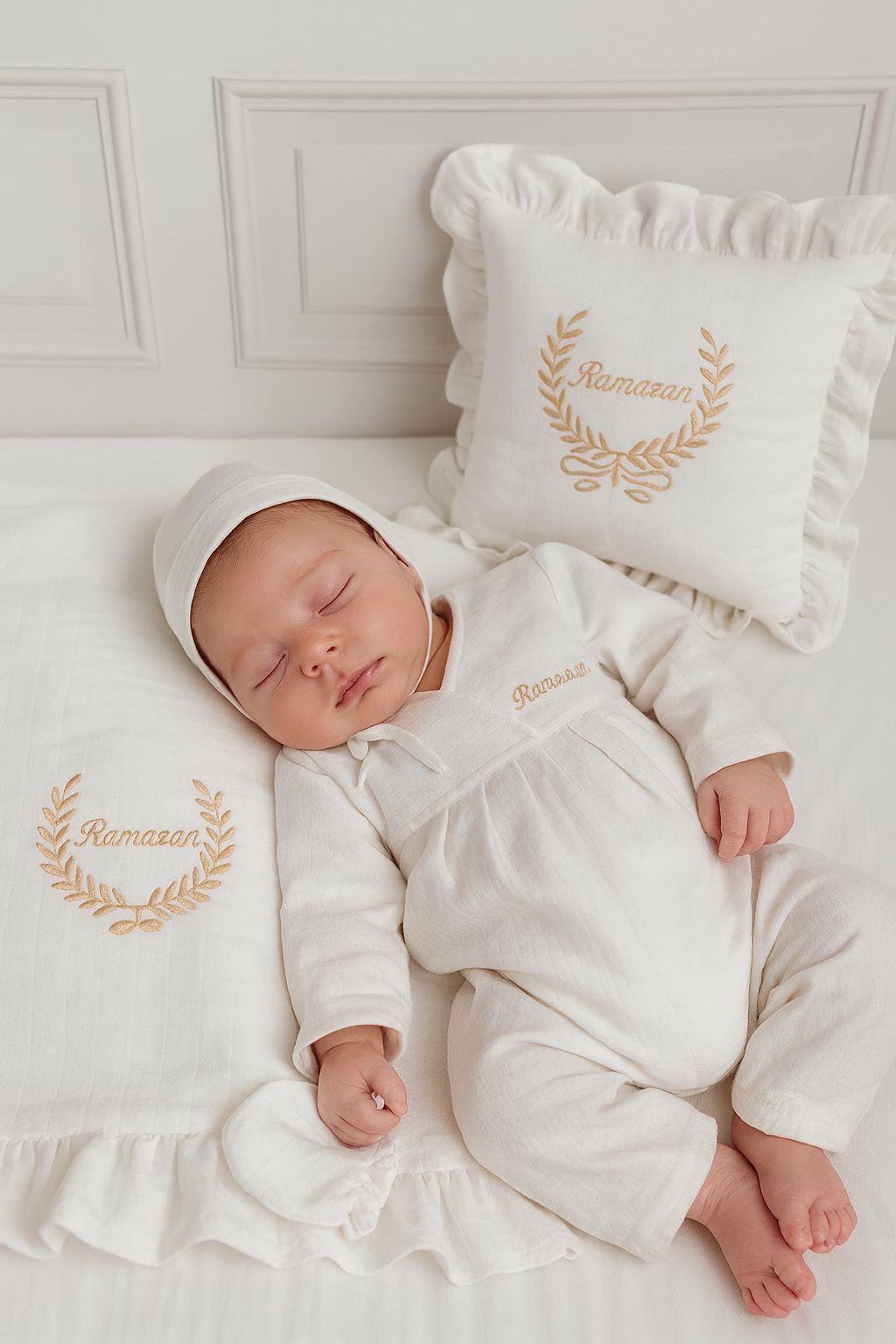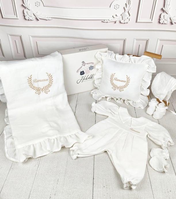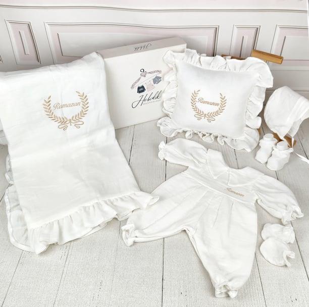 Off-white Shirt-Collar Muslin Jumpsuit and Ruffled Completed Set Made to order after purchase. It is made from cotton jersey fabric. The blanket size is 90-100 cm. The pillow size is 35-40 cm . The jumpsuit, blanket, pillow and accessories are sent as a set. You can select the size range that best fits your measurements from the size chart in the images and place your order. The name embroidery will be done on the chest. Products with name embroidery are personalized and cannot be returned. ATTENTION! If the name form is not filled out, the product will be shipped without the name embroidery! The Off-white Shirt-Collar Muslin Jumpsuit and Ruffled Complete Set is a timeless and elegant ensemble for your little one. Crafted from soft, breathable muslin fabric, this set includes a jumpsuit, blanket, and pillow, all designed for comfort and freedom of movement. The jumpsuit features a classic shirt collar, offering a refined and stylish look, while the ruffled details on the blanket and pillow add a delicate and charming touch. Perfect for both special occasions and everyday wear, this set combines sophistication and practicality. It can also be personalized with a name embroidery, making it a unique and thoughtful gift.