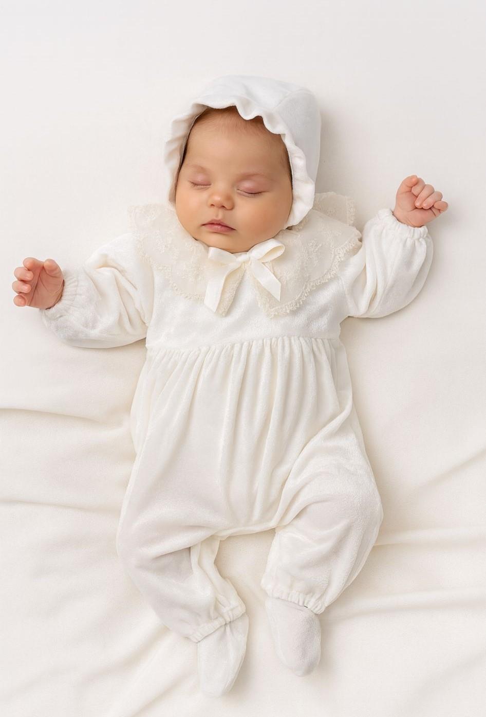 This off-white velvet jumpsuit features a delicate lace collar detail, offering a touch of elegance and softness. Made from premium velvet, it provides both comfort and style for your little one. Perfect for special occasions or everyday wear, this chic jumpsuit is designed for both style and comfort.
