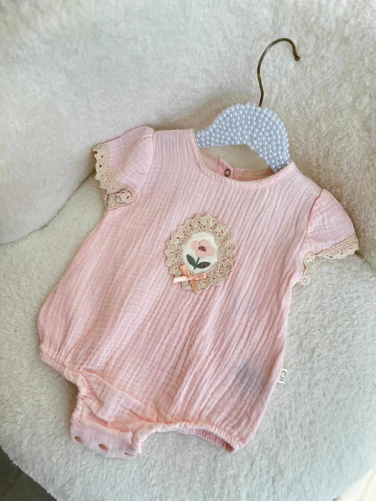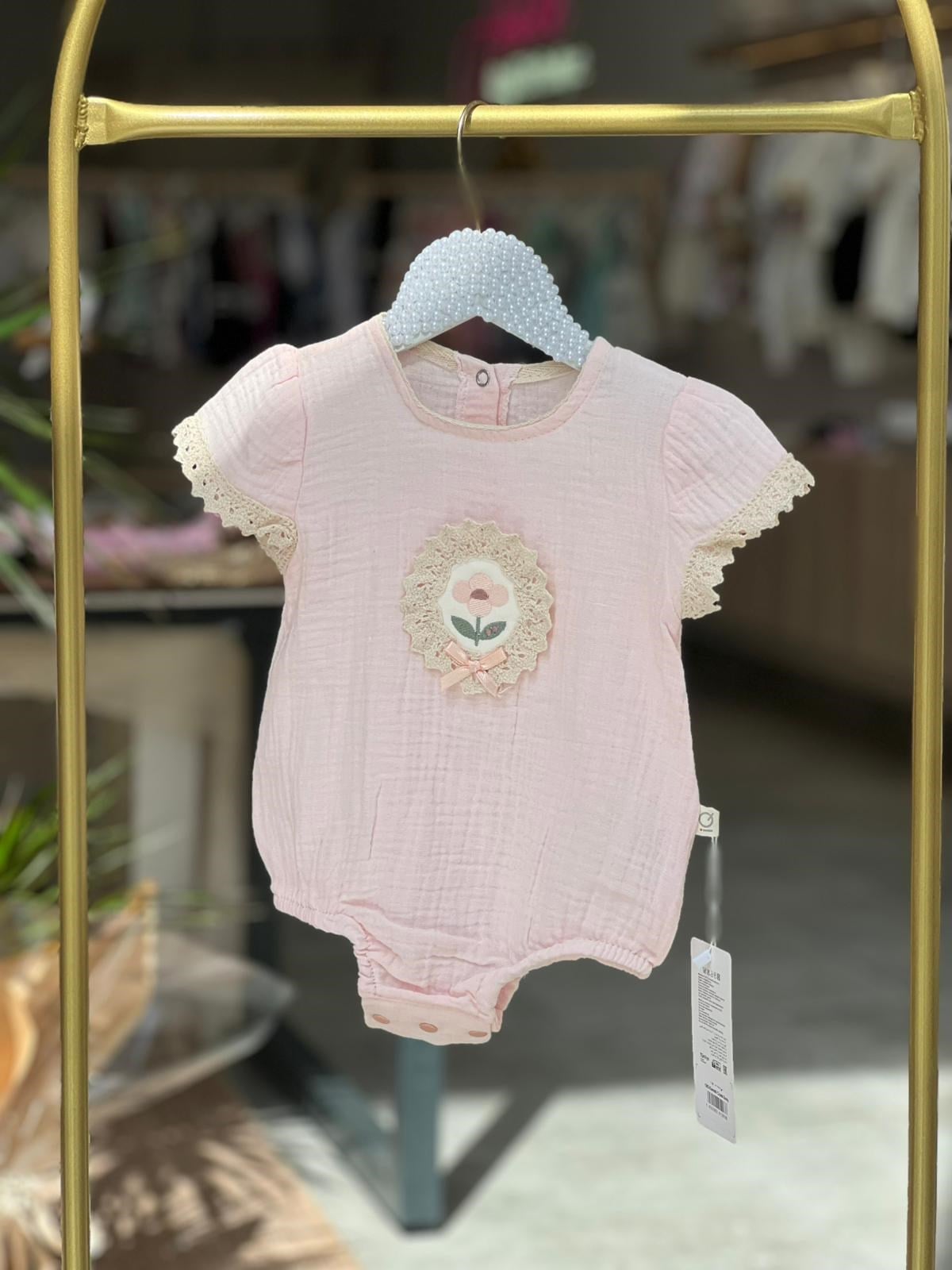 Şık dantel detaylı kolları ve ön kısmındaki çiçek aplikesi ile estetik bir görünüm sunar. Yumuşak dokusu ve esnek yapısı bebeğinizin hareketlerini kısıtlamaz. Alt kısmındaki çıtçıtlı tasarım, kolay giydirme ve pratik bez değişimi imkanı sağlar.