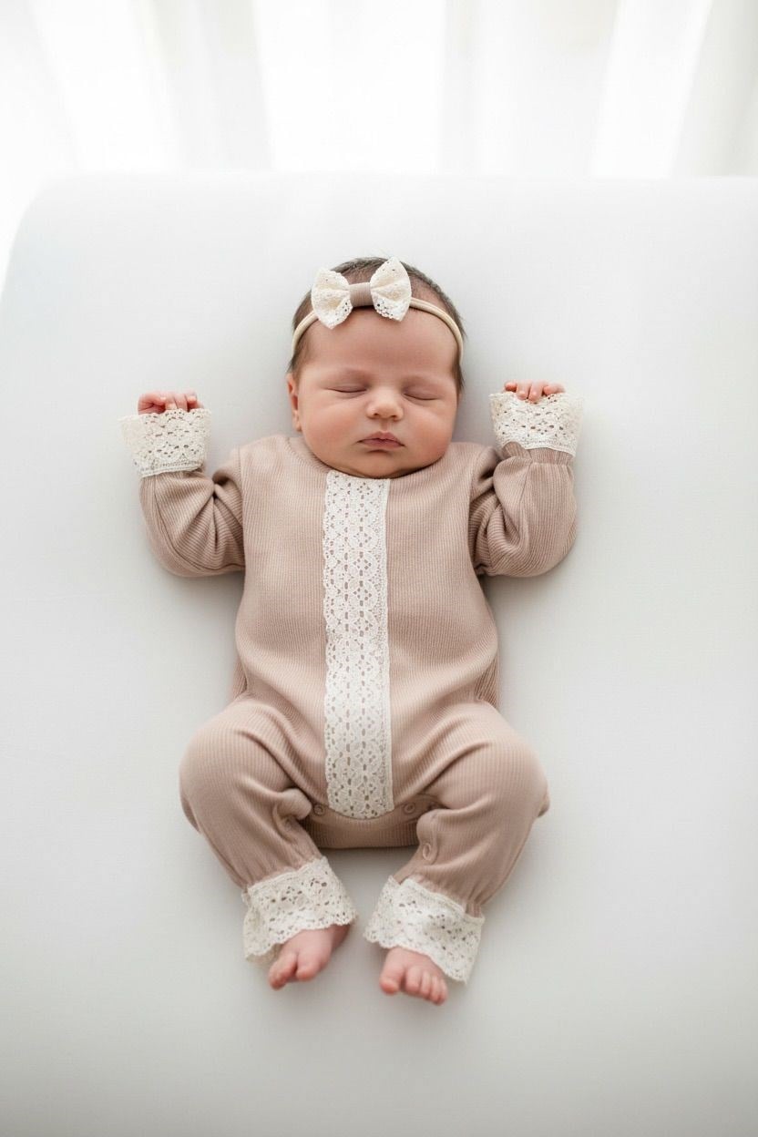 The 0-3 Months Powder Pink Ribbon Lace Trimmed Jumpsuit is made from soft and breathable cotton jersey fabric. Its high-quality, comfortable fit adapts to the body and allows your baby to move freely. With ruffle details and cuffed leg design, it offers an elegant touch of style. This romper, combining comfort and style, is perfect for everyday wear.