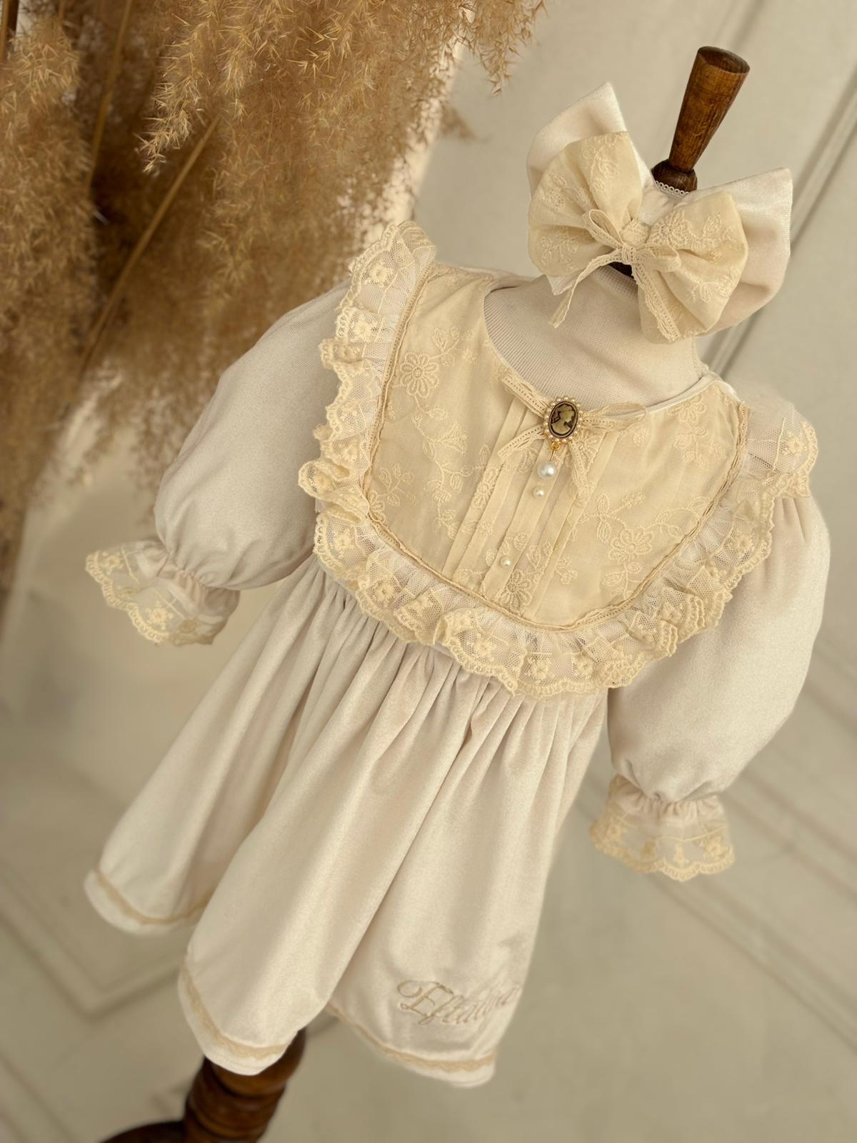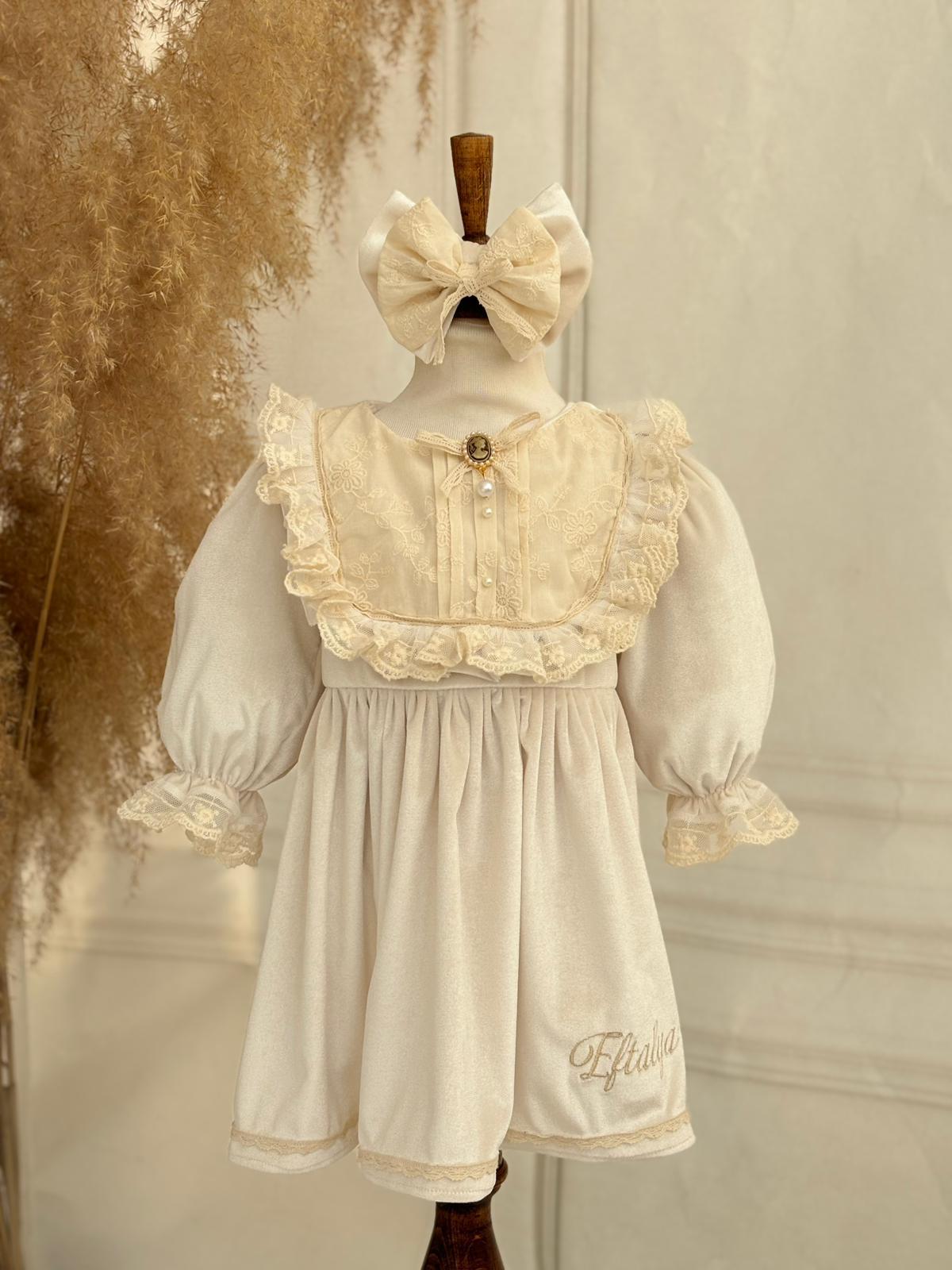 The Cream Guipure Off-White Silk Velvet Dress is a stunning choice for your little princess's special days, combining timeless elegance with perfect comfort. Designed with the finest materials, this dress is perfect for sophisticated events and offers a perfect blend of style and softness.