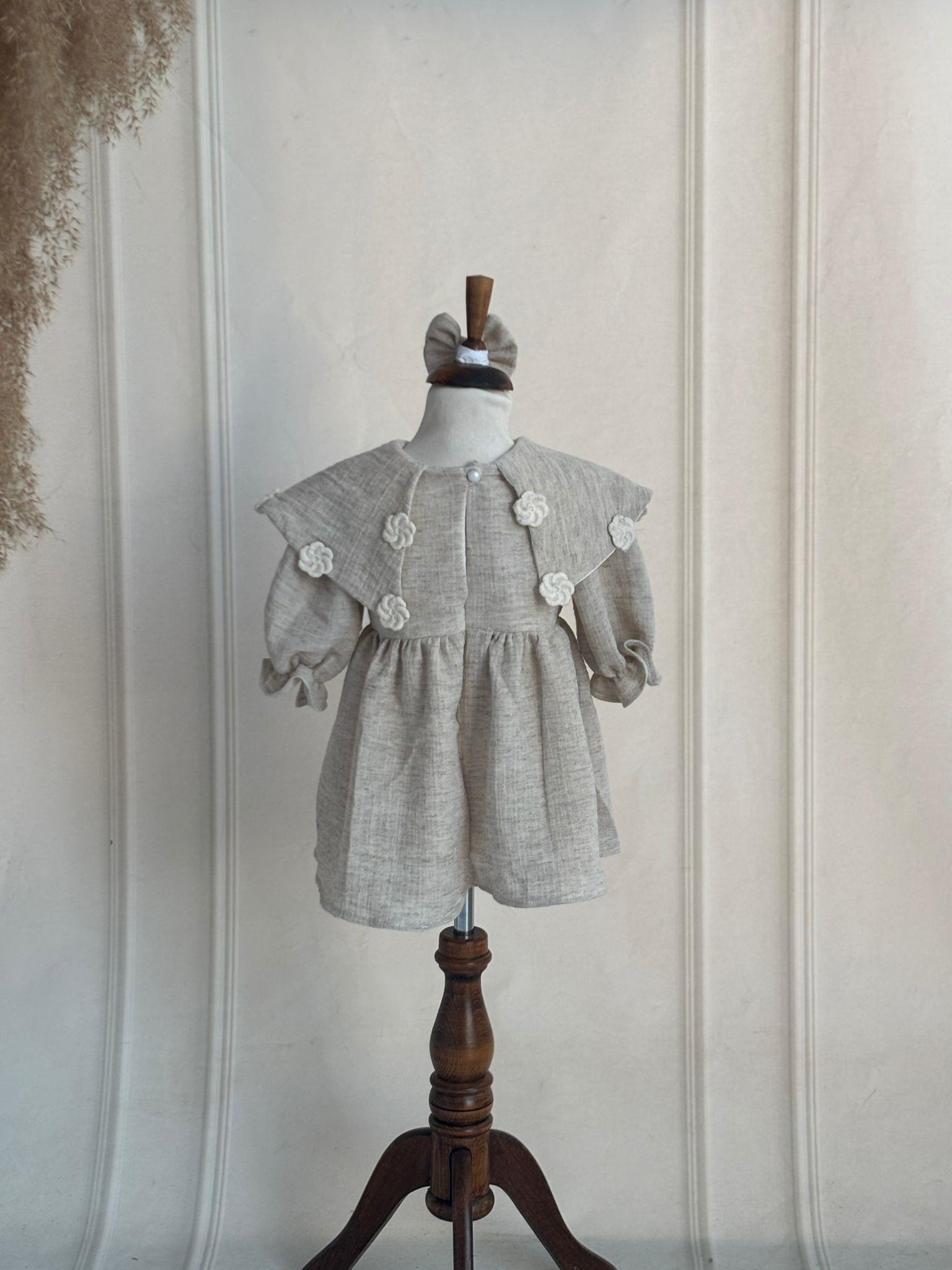 1 Yaş Gri Keten Çiçek Detaylı Elbise
