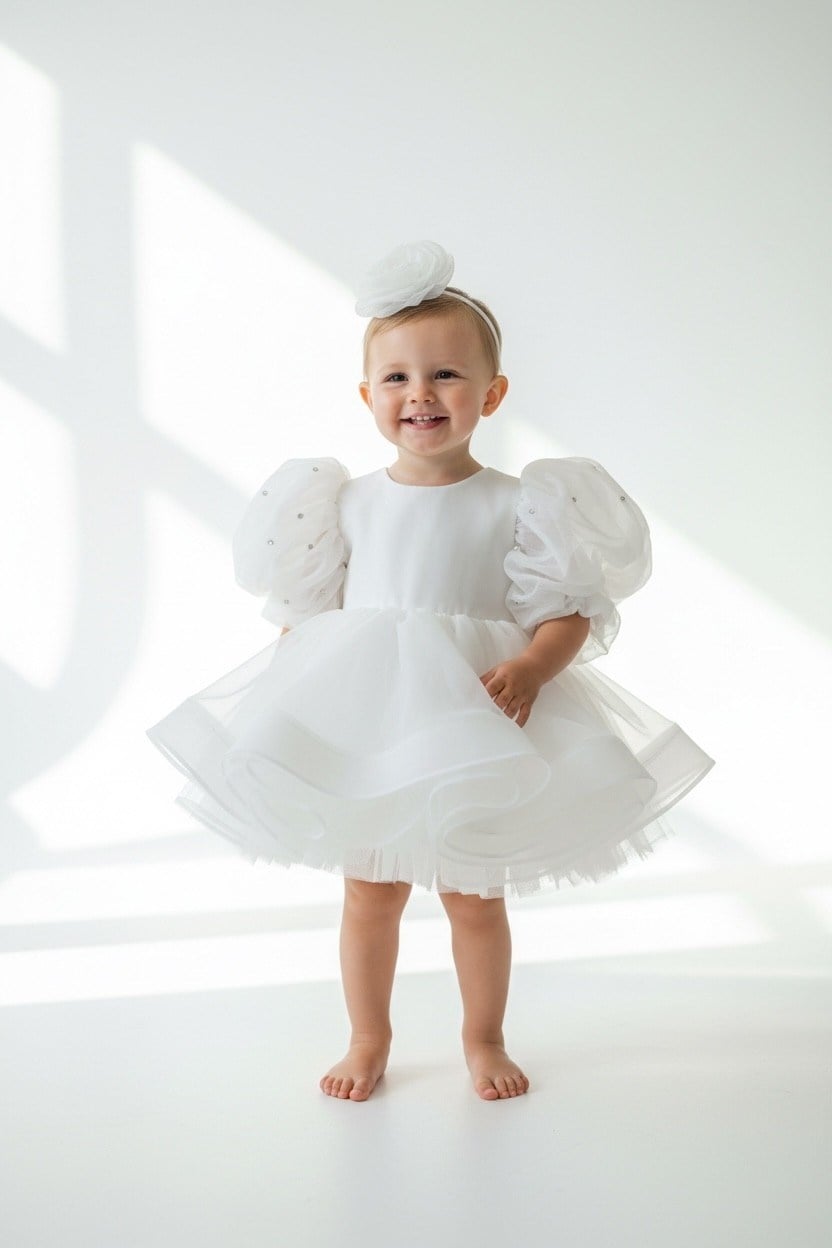 Minik prenseslere özel tasarlanmış bu gösterişli beyaz elbise; taş işlemeli kolları, kabarık organze tülü ve sırtında bulunan taşlı sert tül fiyonk detayıyla göz kamaştırıyor. Özel günler, doğum günü partileri, nikah, düğün ya da fotoğraf çekimleri için mükemmel bir tercihtir.