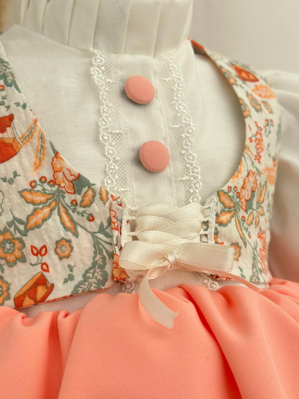 Zarif tasarımıyla öne çıkan somon tonlarının zarif ışıltısı,çiçek desenli yelek detayının nostaljik dokusuyla buluşturan bu özel tasarım elbğise; özel günlerde ve fotoğraf çekimlerinde minik prensesinizin ışıltısını ortaya çıkarır. Kat kat fırfırlı eteği, göğüs kısmındaki düğmeler, el işçiliğiyle hazırlanmış mini korsaj bağlama dateyı ve balon kol detaylarıyla klasik şıklığı modern bir dokunuşla birleştirir.