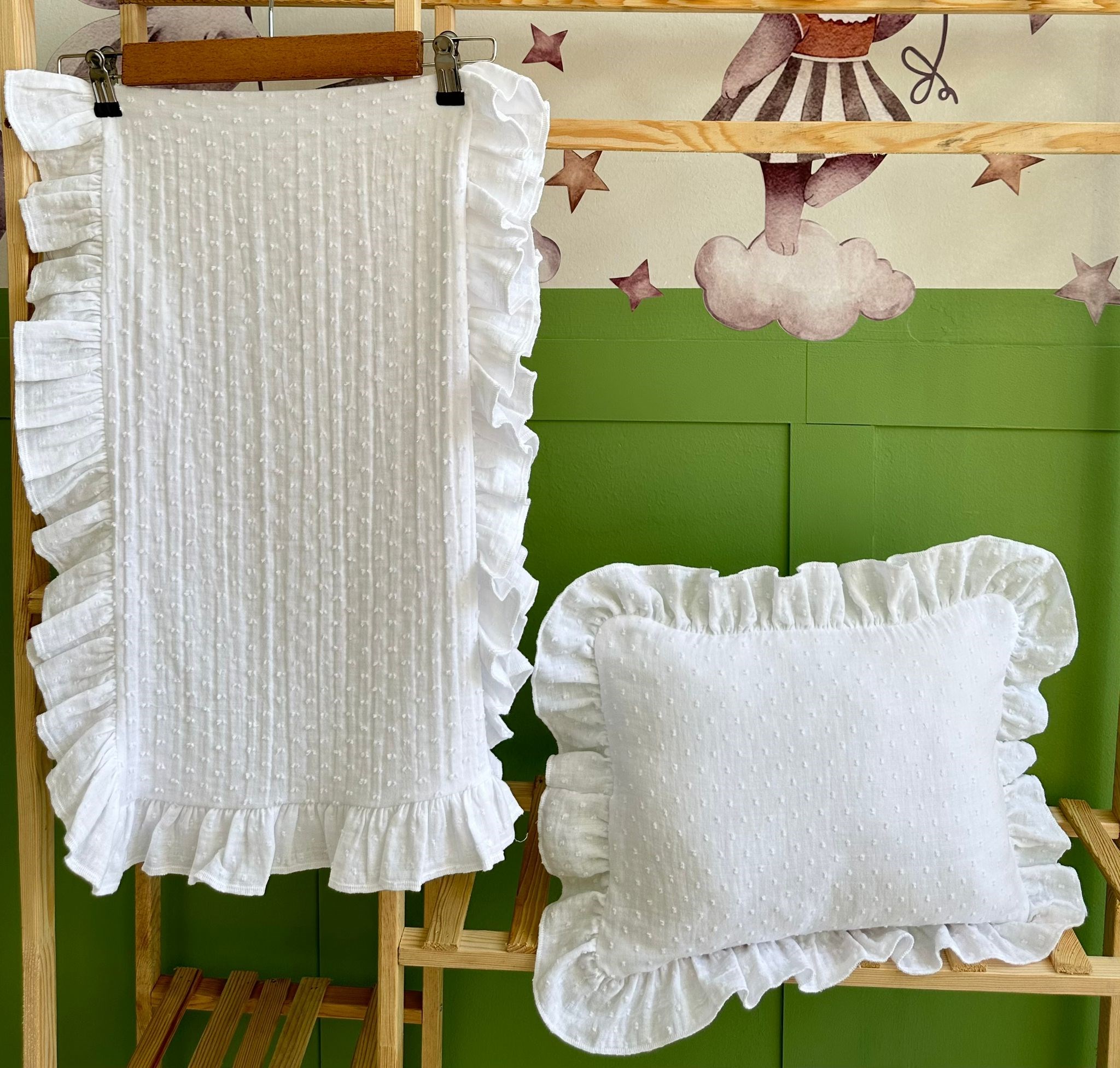 Erkek Beyaz Ponponlu Müslin Battaniye Yastıklı Hastane Çıkış Seti