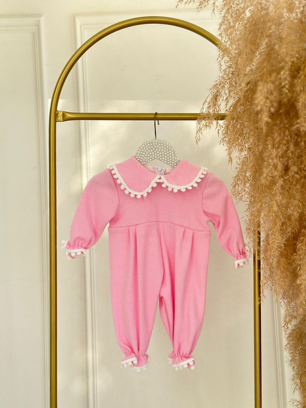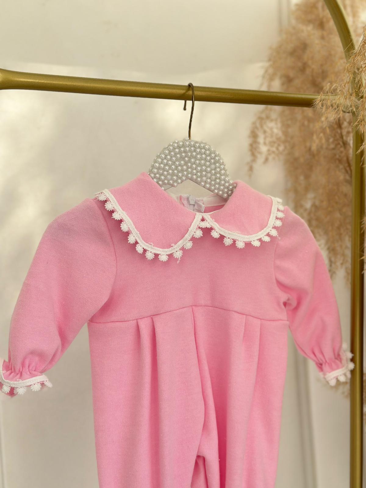 Yaka, kol ve paça uçlarındaki zarif dantel detaylarıyla şık bir görünüm sunar.