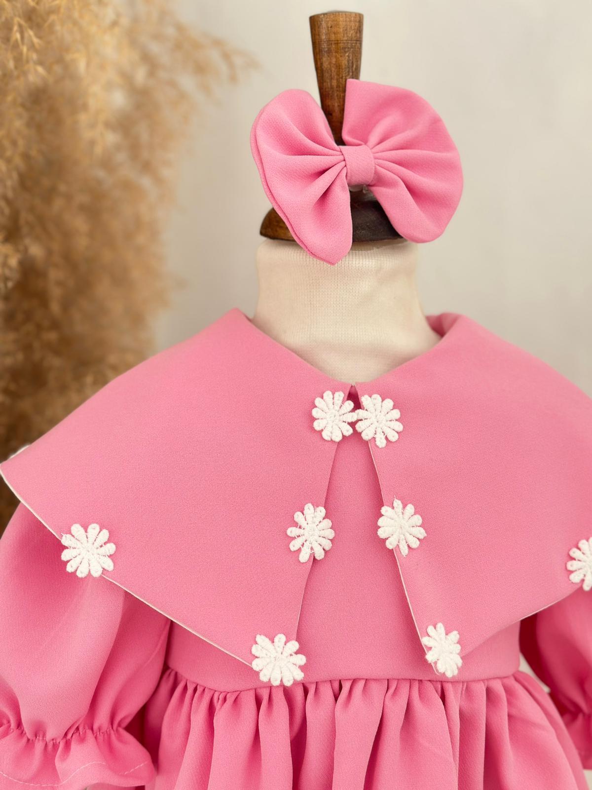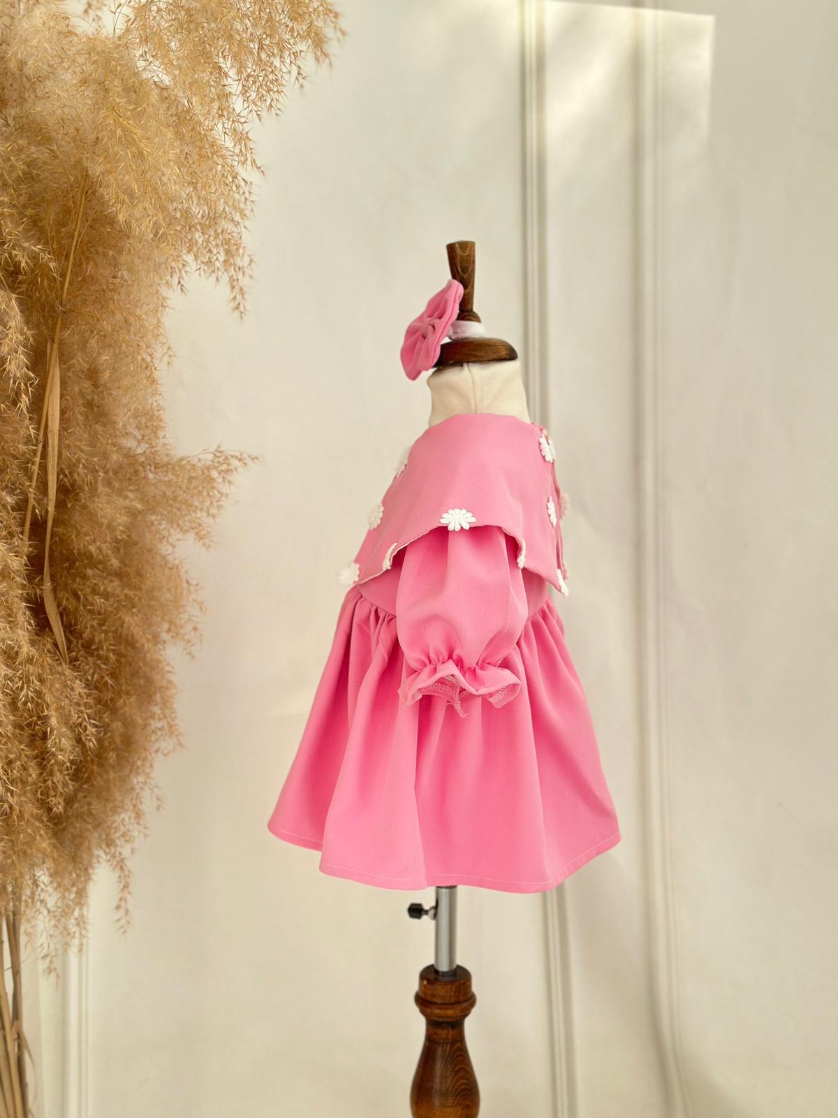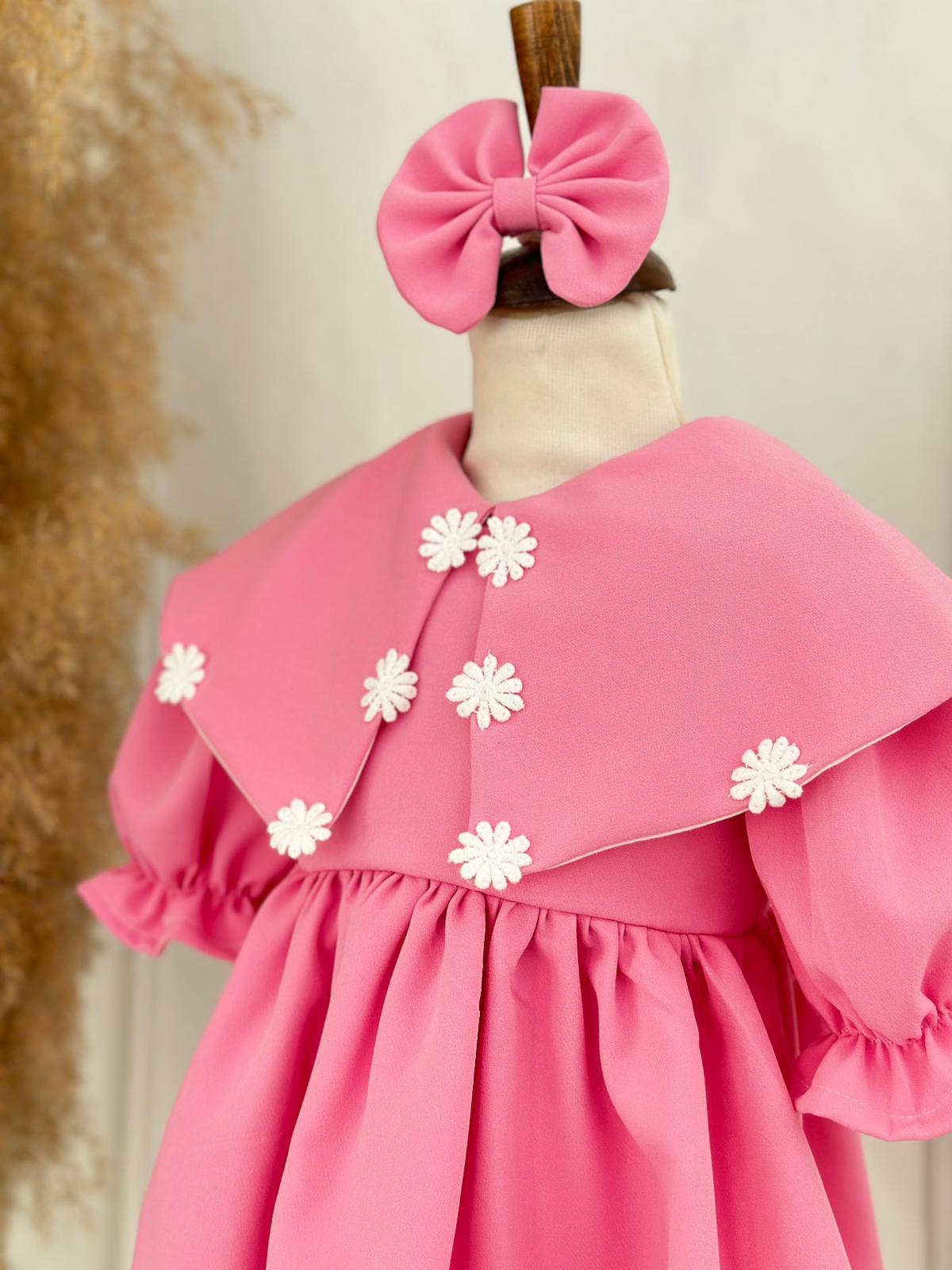 Zarif ve şık bir görünüm sunan pembe krep kumaş çiçek detaylı elbise, minik prensesler için özel olarak tasarlanmıştır. Göğüs kısmındaki çiçek aplikeleri, estetik bir dokunuş katarken krep kumaşın hafif yapısı rahatlık ve özgür hareket sağlar. Bu elbise, doğum günü, mevlüt ve diğer özel günlerde mükemmel bir tercihtir.
