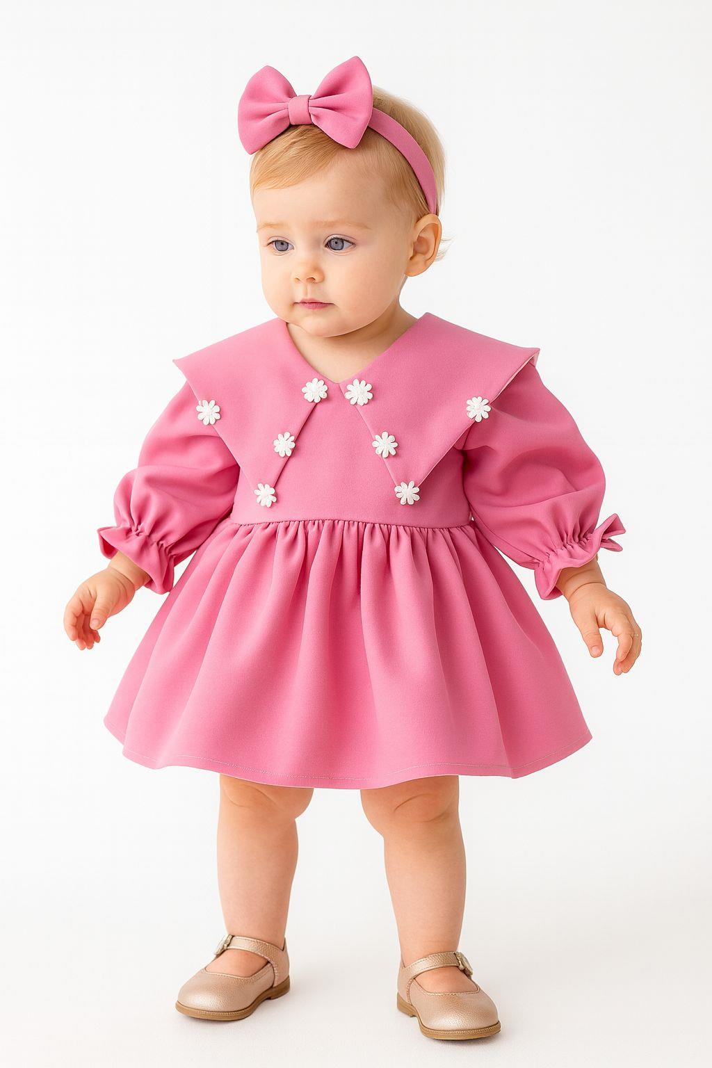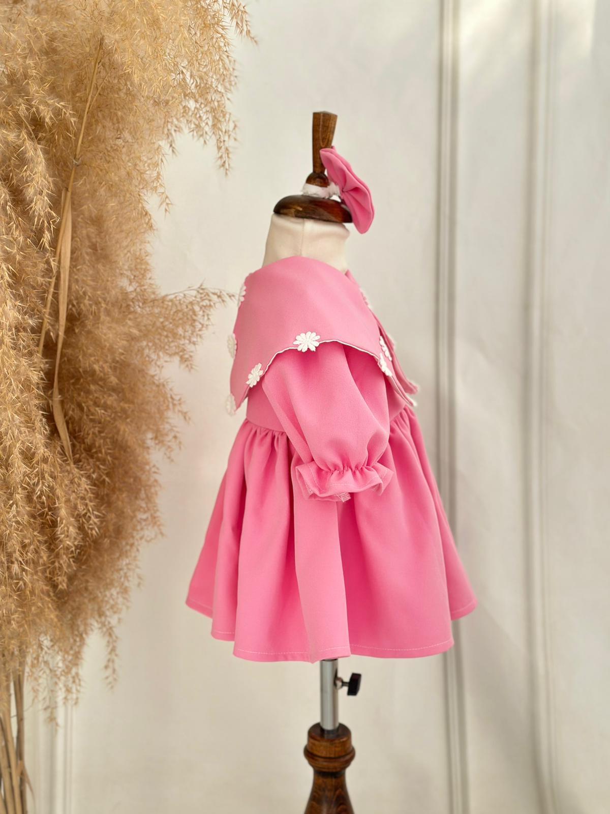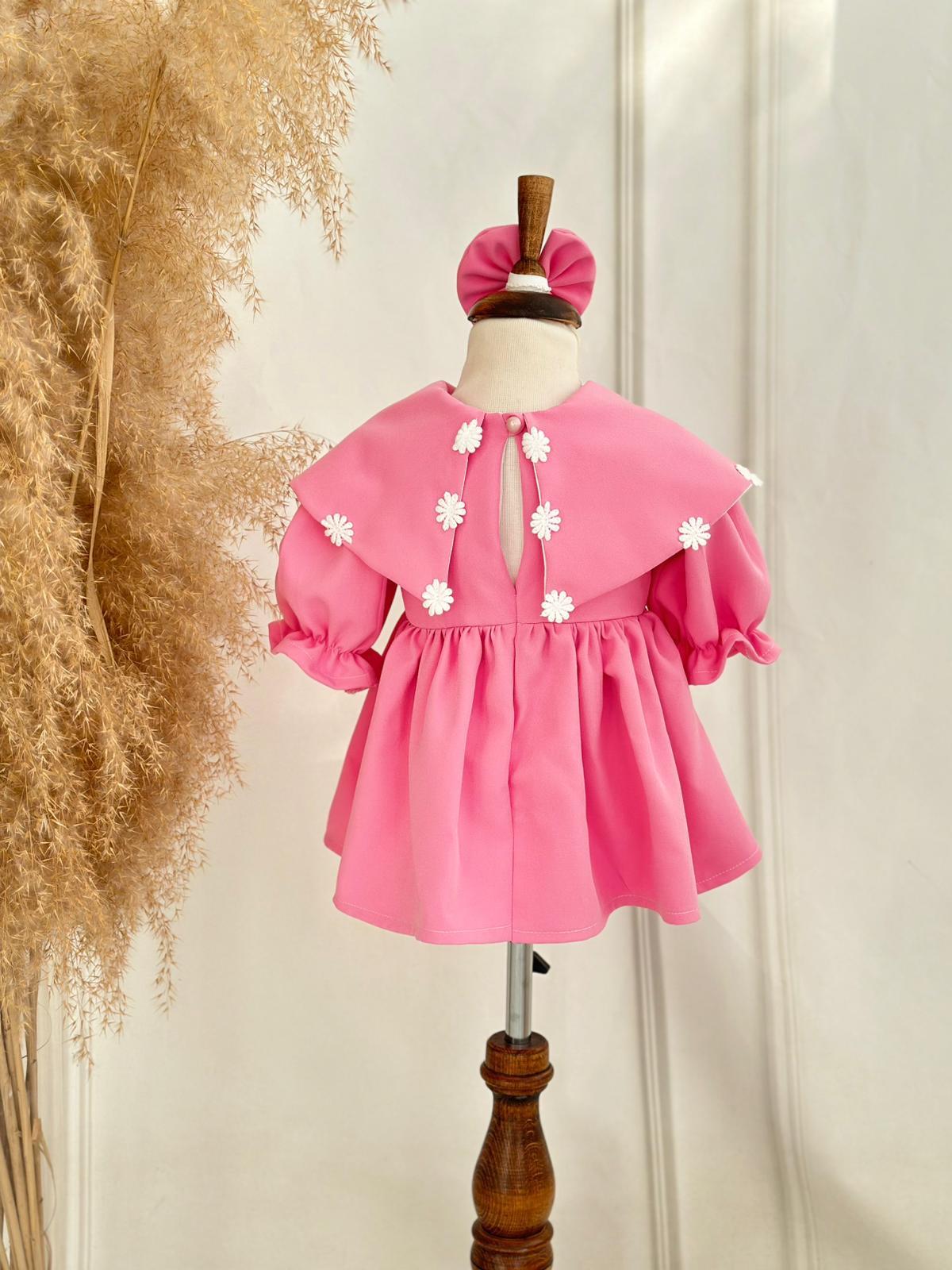 Zarif ve şık bir görünüm sunan pembe krep kumaş çiçek detaylı elbise, minik prensesler için özel olarak tasarlanmıştır. Göğüs kısmındaki çiçek aplikeleri, estetik bir dokunuş katarken krep kumaşın hafif yapısı rahatlık ve özgür hareket sağlar. Bu elbise, doğum günü, mevlüt ve diğer özel günlerde mükemmel bir tercihtir.