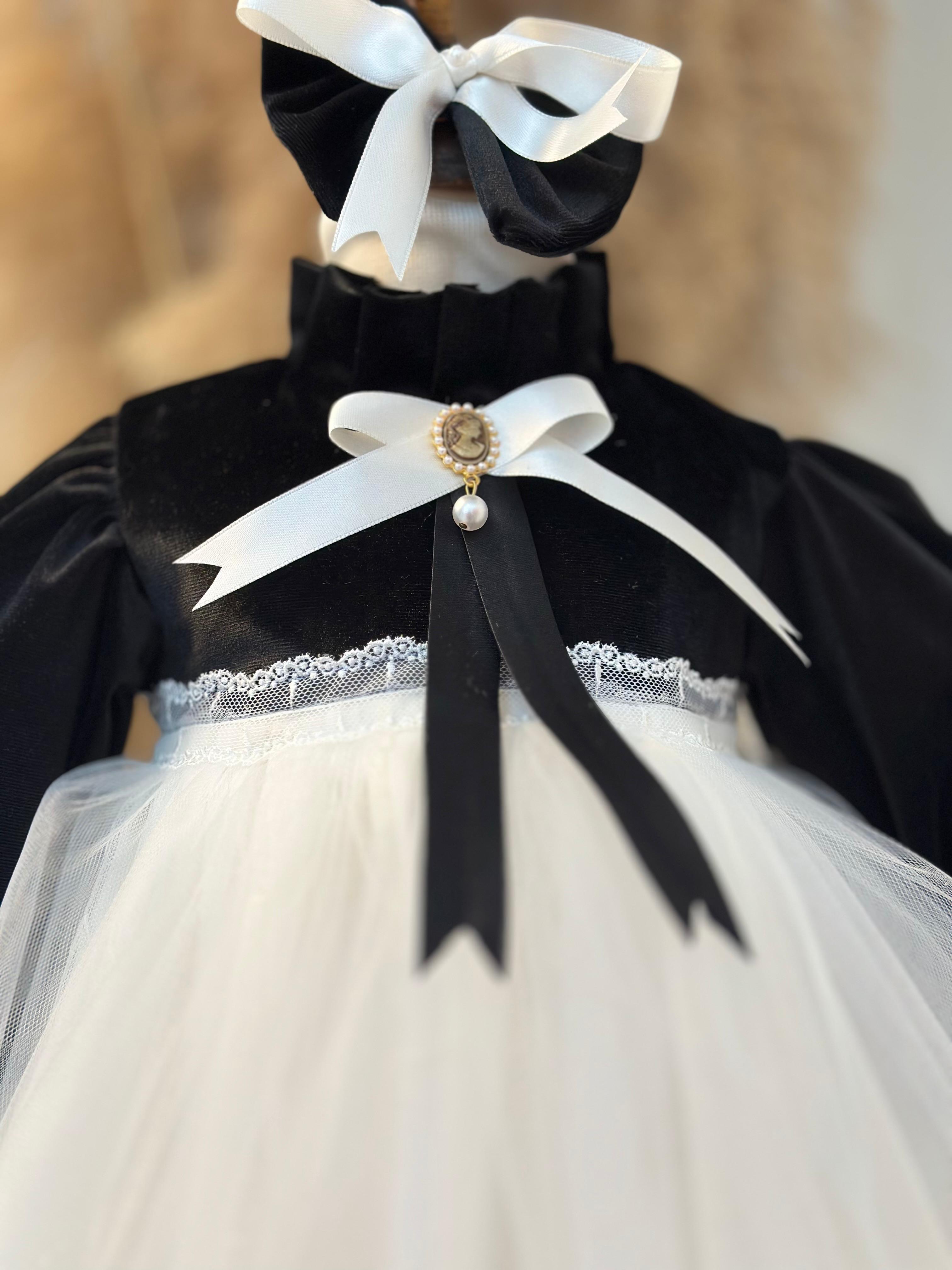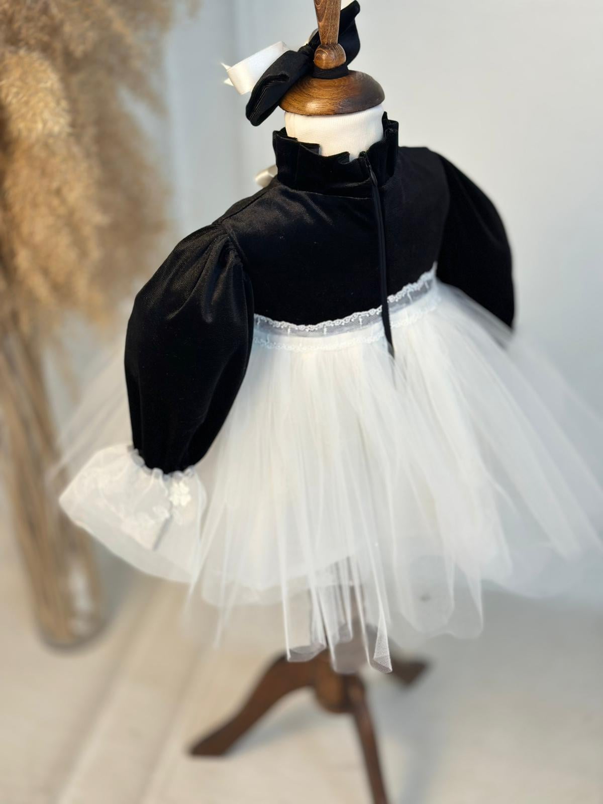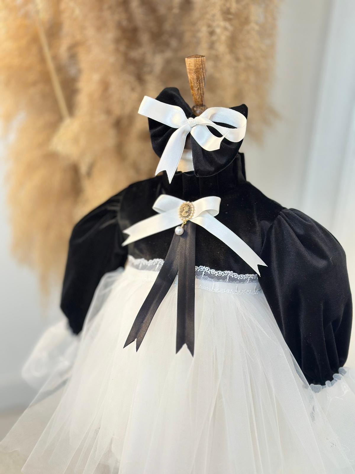 Siyah ipek kadife üst gövdesi ve zarif tül etek tasarımıyla öne çıkan Vintage Bebek Elbisesi, özel gün konseptlerinde klasik şıklığı modern detaylarla buluşturmak üzere geliştirilmiştir. Ürün, yüksek kalite standartlarına uygun olarak üretilmiş olup bebek cilt yapısına duyarlı materyaller tercih edilmiştir. Kontrast renkli kurdele aksesuarı ve dantel dokulu kol manşetleri, elbiseye sofistike bir görünüm kazandırırken; hafif, nefes alabilen etek formu bebeğin hareket özgürlüğünü destekler.